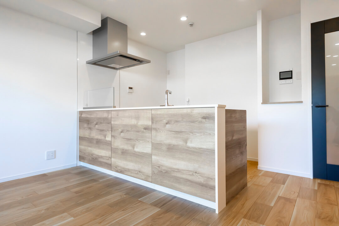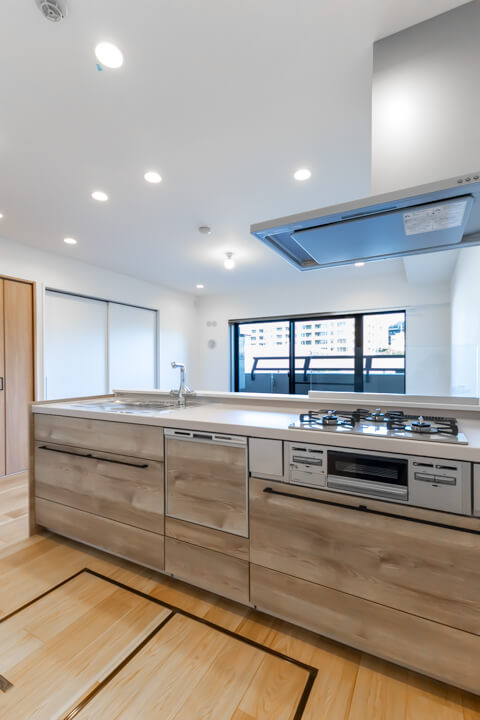 木目デザインが空間に調和する、家具のようなキッチン。開放的な気分で調理ができる対面型です。リビングダイニングを見渡し、家族やゲストとの会話を楽しめそうですね。コンロ前には油跳ねガードが設置されていて安心です。