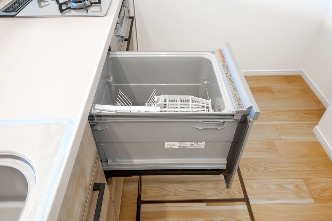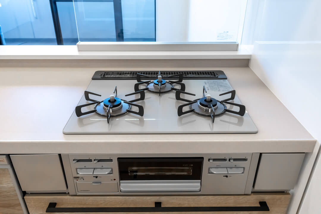 効率良く調理ができるグリル付3口ガスコンロを搭載。料理のレパートリーも増えそうです。さらに、食洗機が内蔵されているので、後片付けが捗り、節水効果も期待できます。