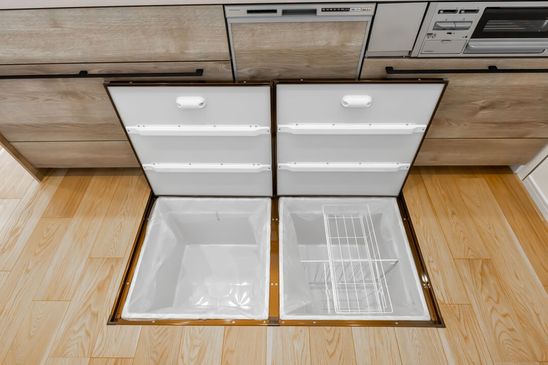 キッチン本体の収納に加え、床下収納も付いているのが嬉しいポイント。重量のある飲料や缶詰など保存食の収納にぴったりです。
