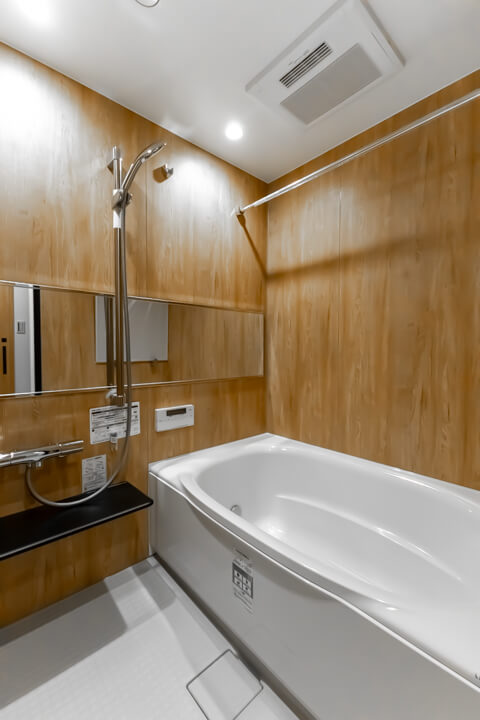 浴室も木目デザインで、温かみを感じる空間。ワイドミラーが奥行きをもたらし、広々とした印象になります。換気・暖房・乾燥・涼風機能付きで1年中快適なバスタイムに。半身浴に便利な追い焚き機能も搭載されています。