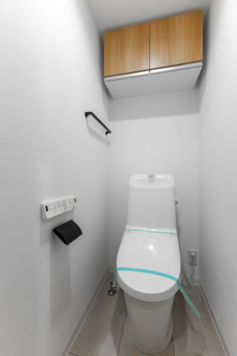 廊下に面していて独立性の高いレストルーム。LIXIL製の洗浄機能付トイレに交換済みです。吊戸棚完備でトイレットペーパーや掃除用品をすっきり収納できます。