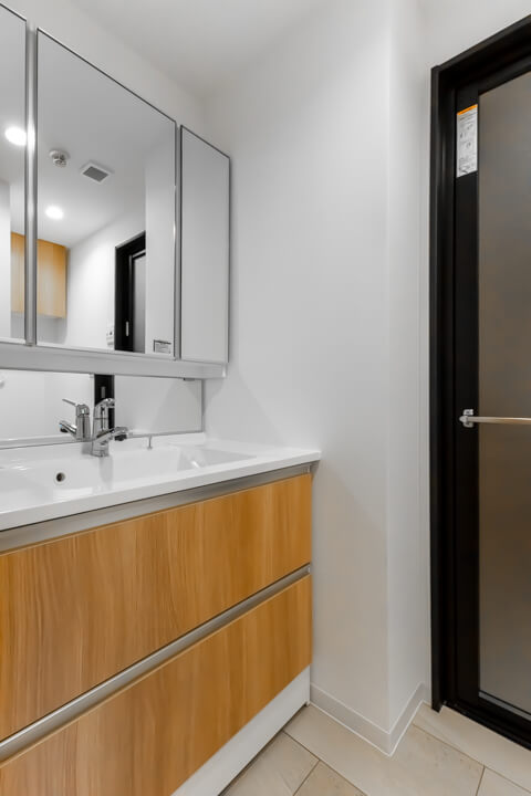 お部屋に馴染む木目デザインの洗面化粧台。大きな三面鏡&ミドルミラー付きで身だしなみを整えるのに便利です。洗面ボウルはカウンターと一体成型なので、汚れが溜まりづらくお手入れ簡単。背面には洗濯機置き場と可動棚があり、使い勝手の良い空間です。