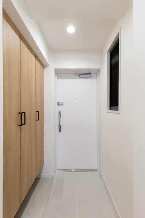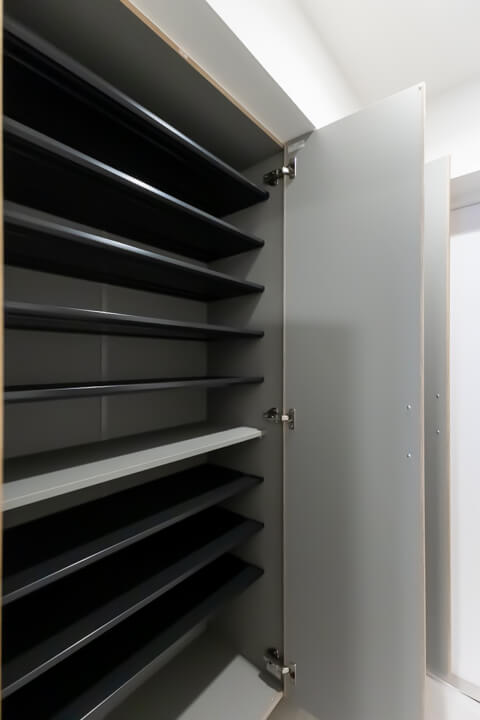 人感センサー搭載でいつも明るく出迎えてくれる玄関。荷物で両手が塞がっている時や夜遅く帰宅した時に、スイッチを探す手間がかからず助かります。大容量のシューズボックスがあり、収納力◎。散らかりがちな靴をすっきり収納できます。