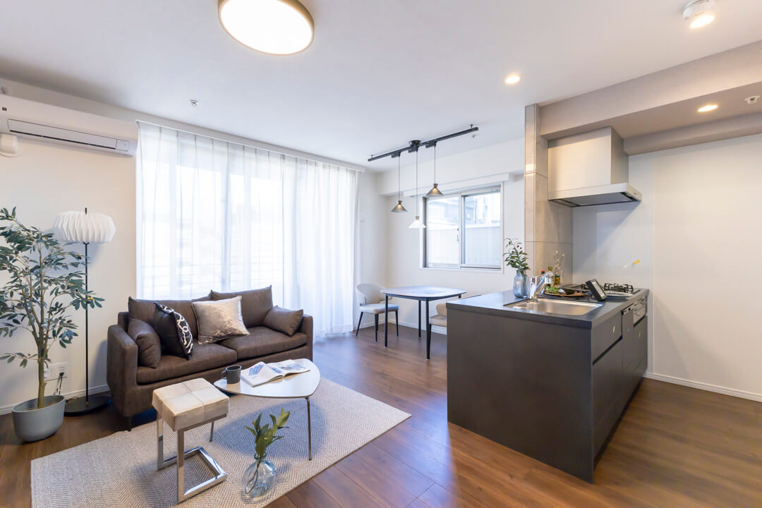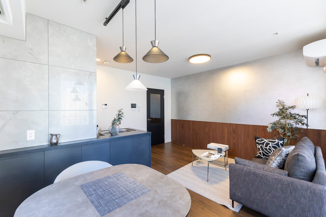 約10.3帖のLDK。大きな窓から自然光がたっぷり降り注ぎます。2面窓で風通しの良さも魅力的ですね。グレー系のクロスや木目調の腰壁がアクセントになり、上質な空間を演出します。
