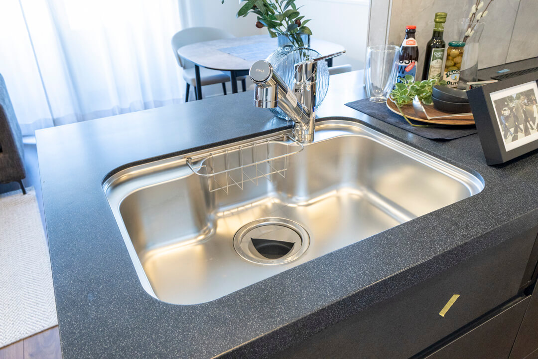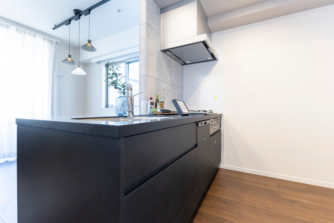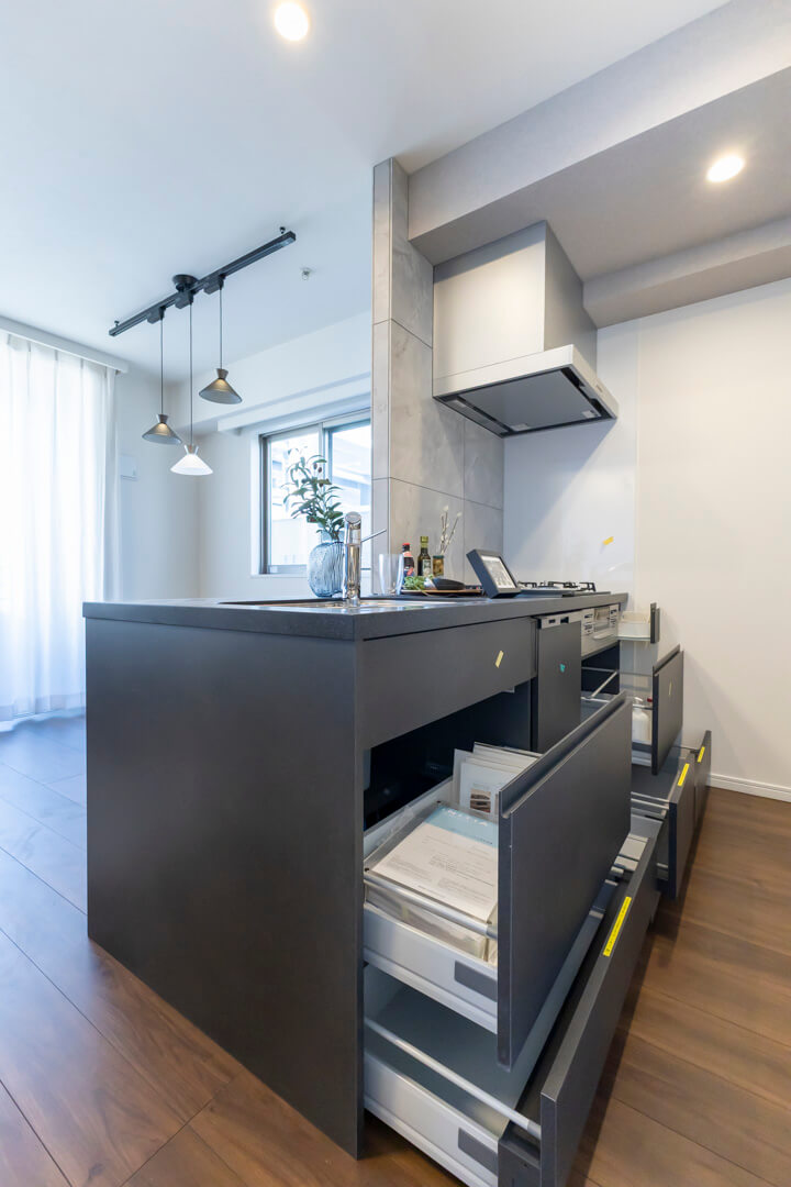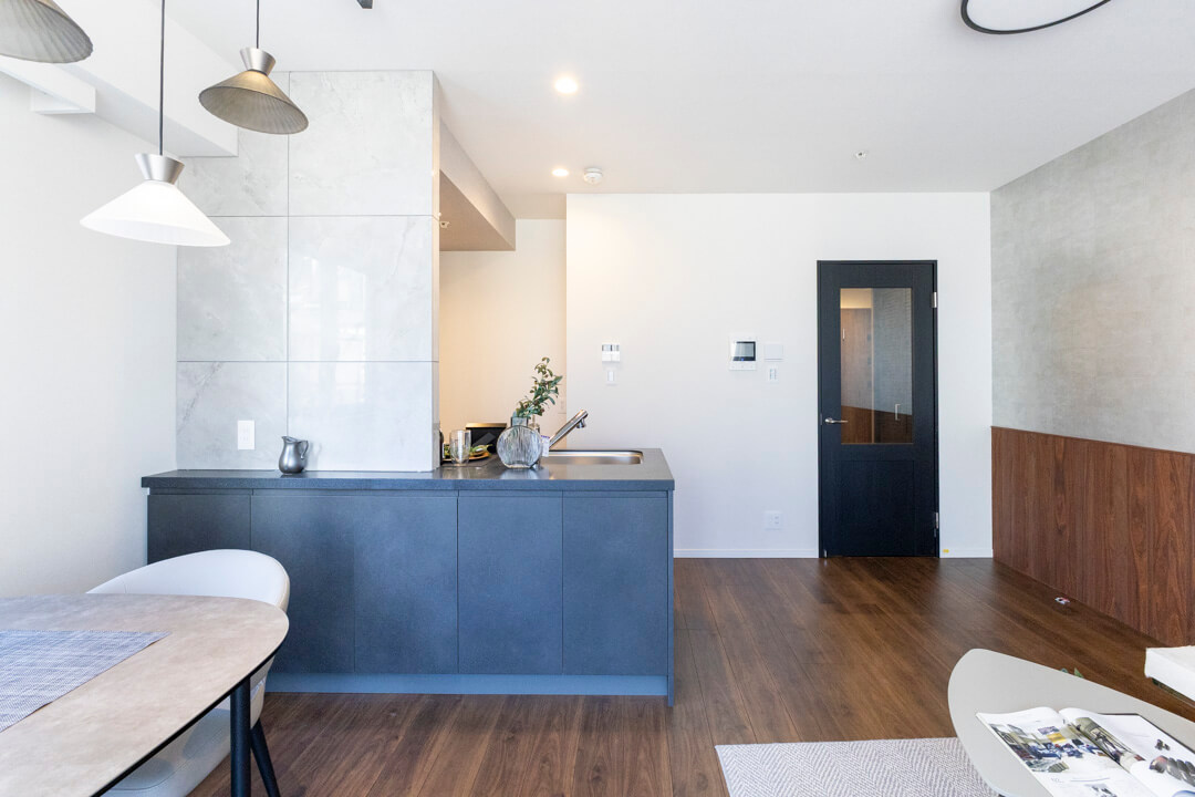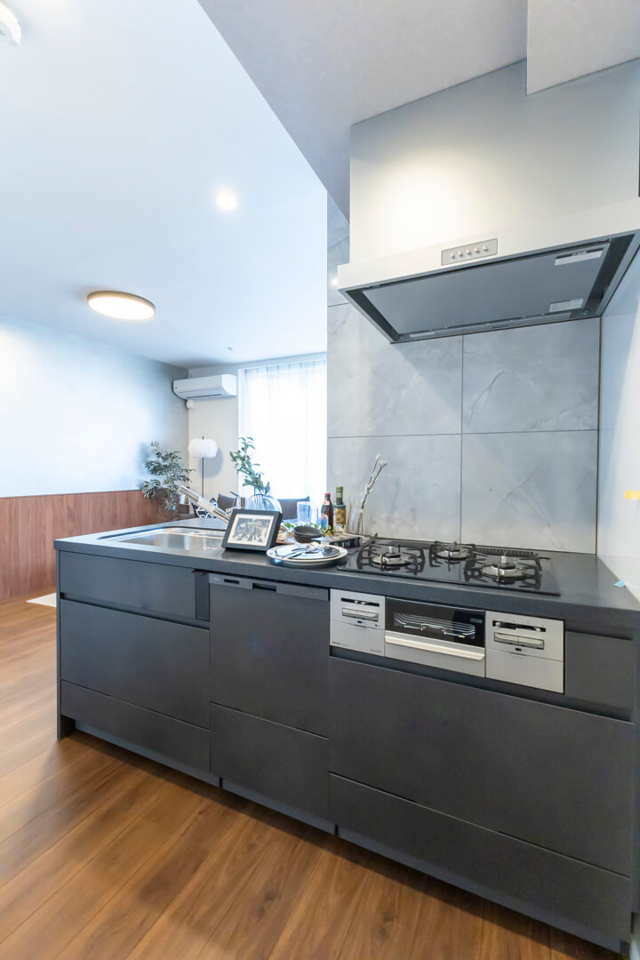 リビングダイニングの中に、家具のように映えるキッチン。重厚感の漂うデザインが印象的です。シンク側からはリビングダイニングを見渡すことができ、パートナーやゲストとの会話を楽しみながら調理ができますよ。