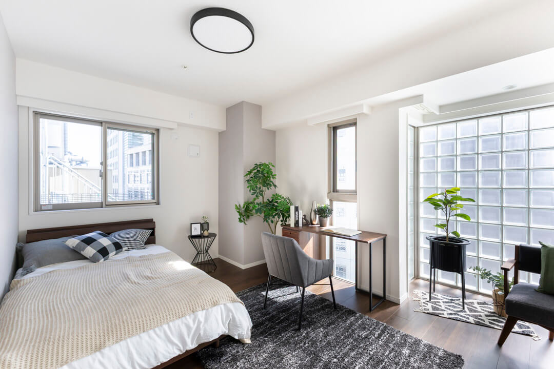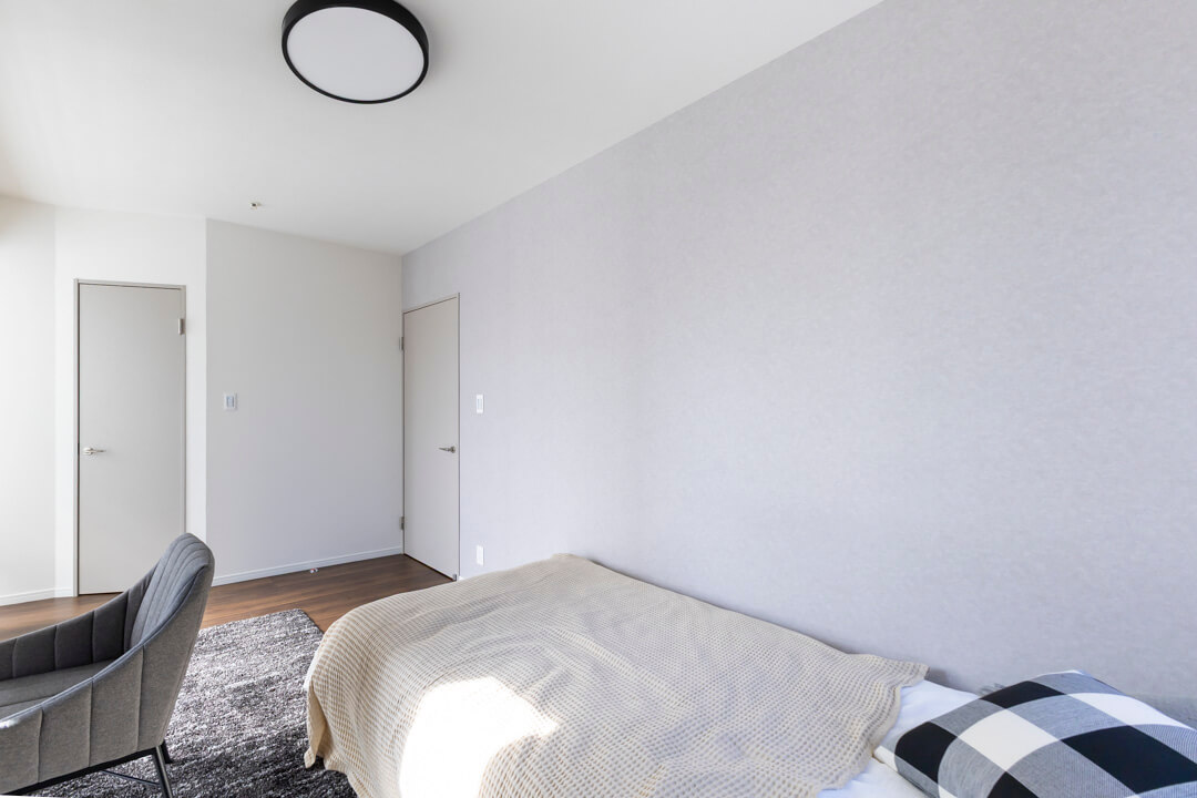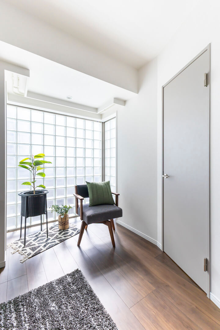 約9.1帖のゆとりある洋室。窓が多くて明るい空間です。ガラスブロックでデザイン性も◎。やわらかな自然光を取り入れることができますよ。くつろぎのベッドスペースとデスクスペースを分けて配置することができ、自分だけの心地よい居場所になりそうです。