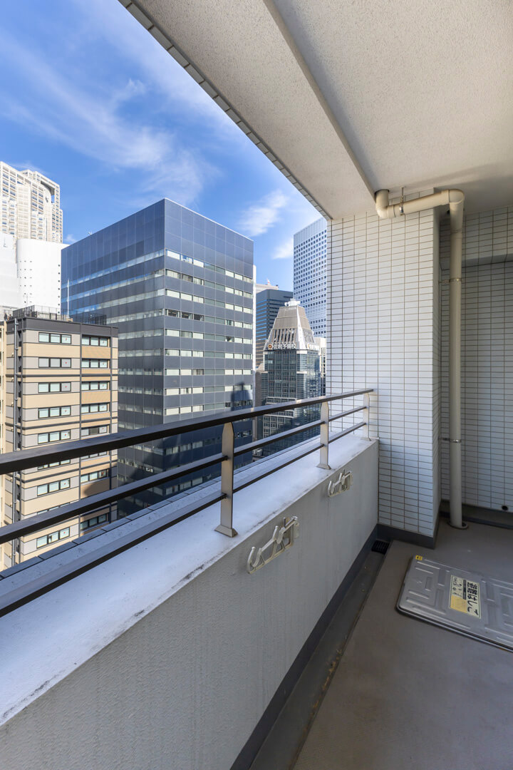LDKに面するバルコニー。7.59㎡です。周辺には高いビルも多いですが、13階部分のため遠く広がる青空を望むことができます。