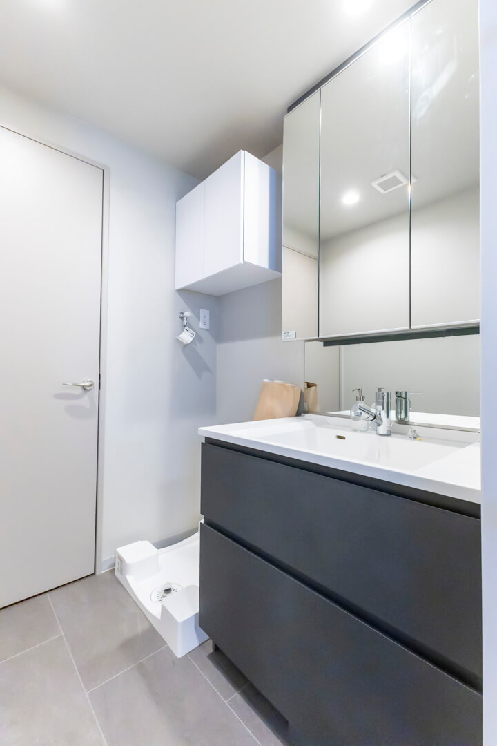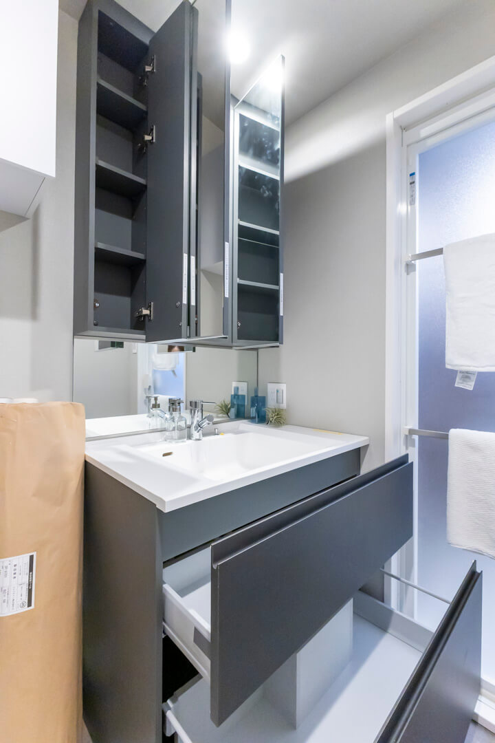 脱衣スペースを兼ねた洗面室には、大きな三面鏡付きの洗面化粧台を設置。ミドルミラーも付いていて、身だしなみを整えるのに便利です。三面鏡裏は収納棚になっていて、洗面まわりの小物をすっきり収納できますよ。洗面ボウルはカウンターと一体成型なので、汚れが溜まりづらくお手入れしやすいのも嬉しいポイントです。