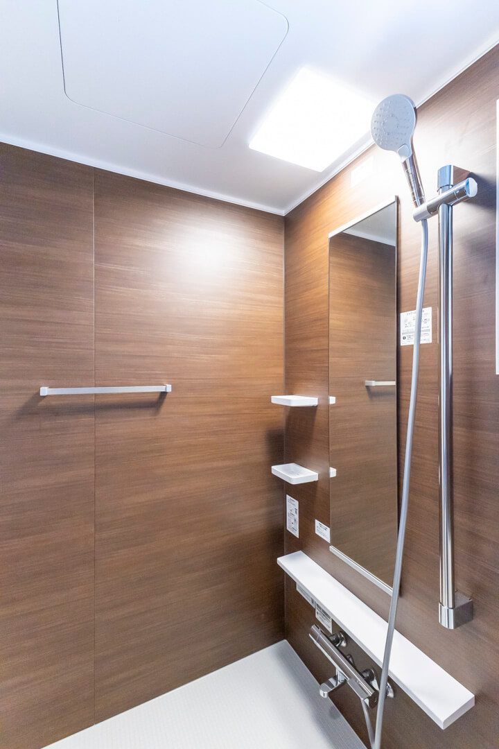 1317サイズのバスルーム。木目柄パネルが温もりある空間を演出します。浴室換気乾燥暖房機・追い焚き機能搭載で、1年中快適なバスタイムに。二重断熱構造の魔法びん浴槽は保温性が高く、追い焚き時間を短縮できます。窓付きで自然換気ができるのも嬉しいポイントです。