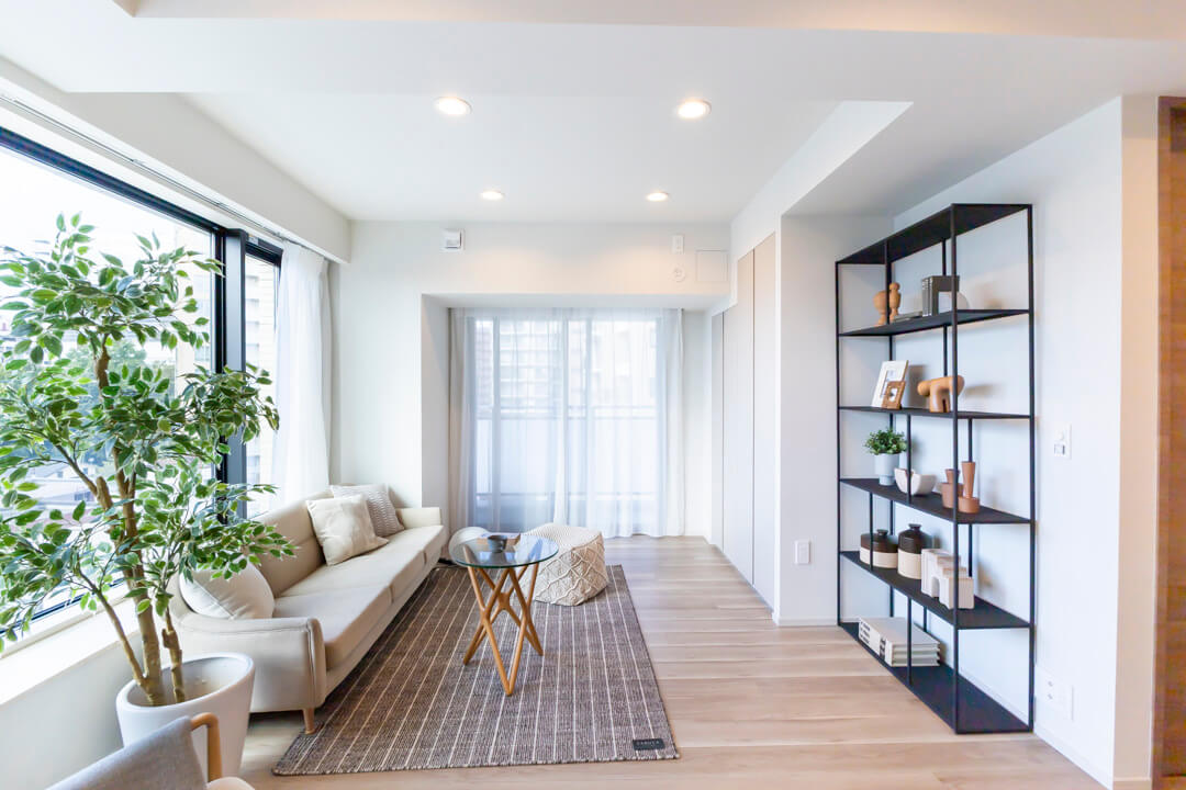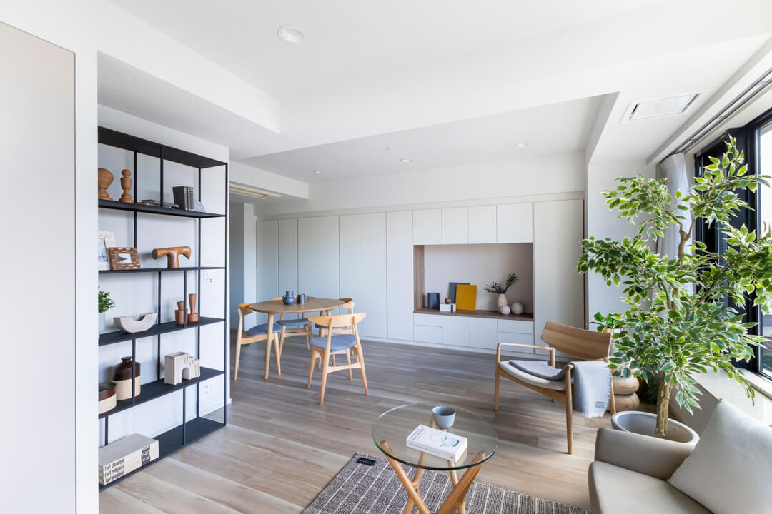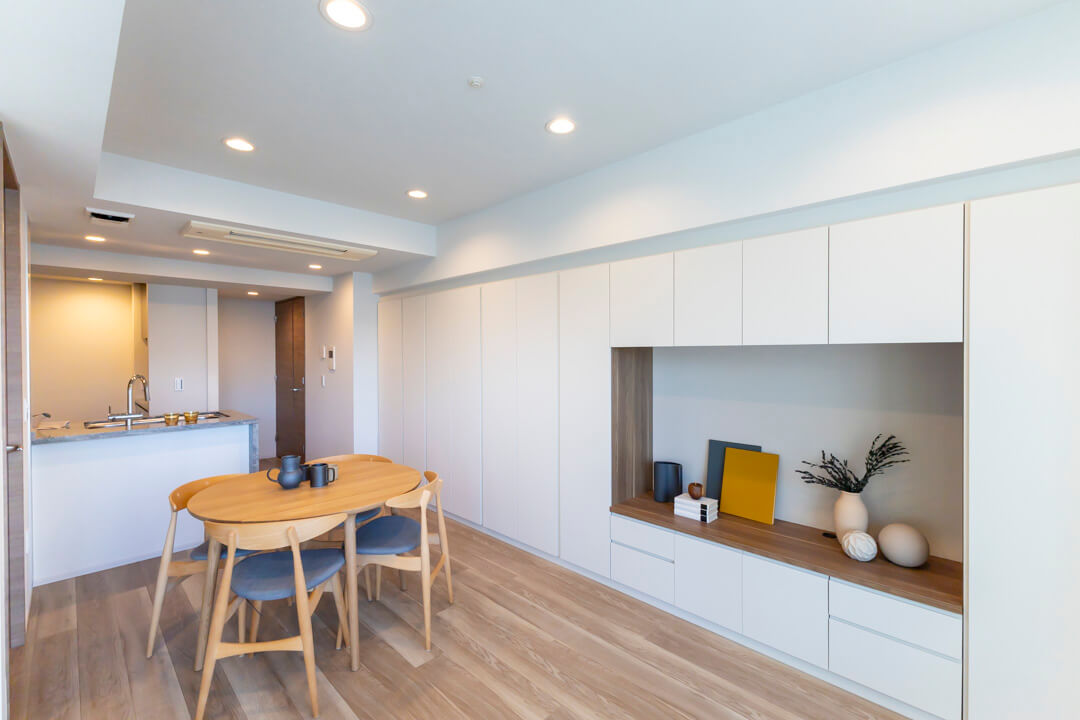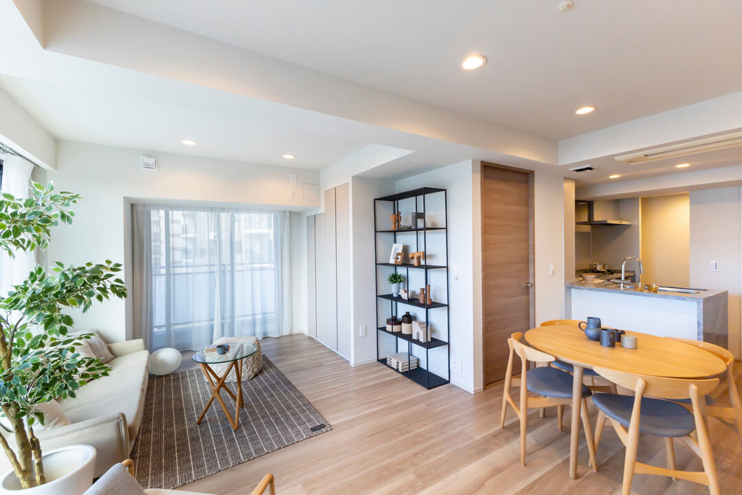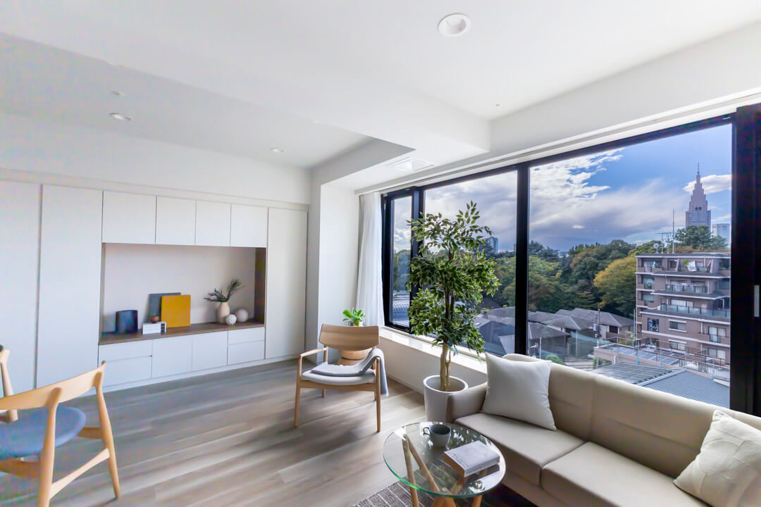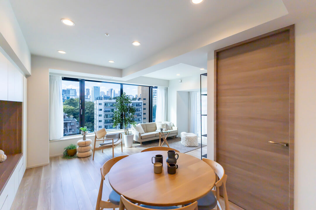約19.4帖の広々としたリビングダイニングキッチンは、二面採光になっていて開放感があります。大きな窓からは新宿御苑が望め、桜や紅葉など、四季折々の風景が日々の暮らしを彩ります。