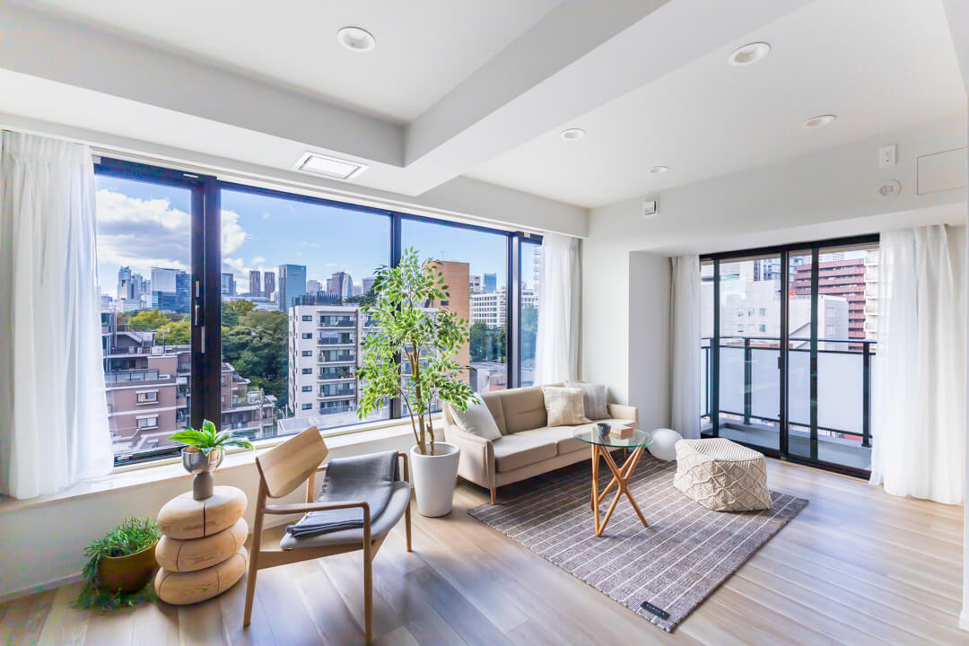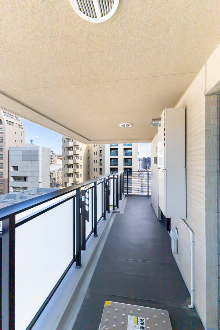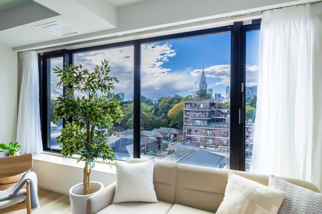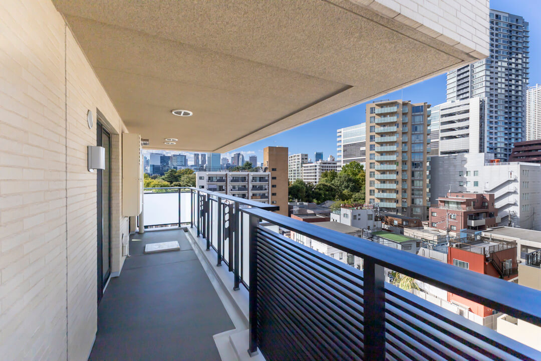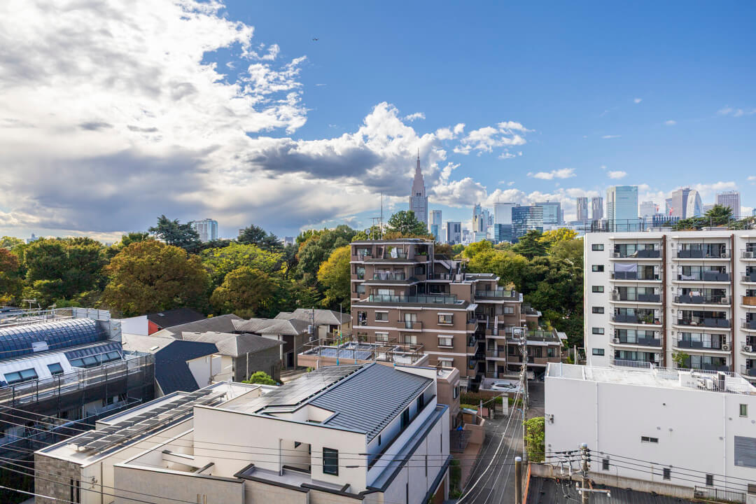 約15.02㎡の広々としたバルコニーです。7階部分で抜け感のある眺望、北西方向には新宿御苑の緑が望め、都会の喧騒を忘れさせる穏やかな景観となっています。