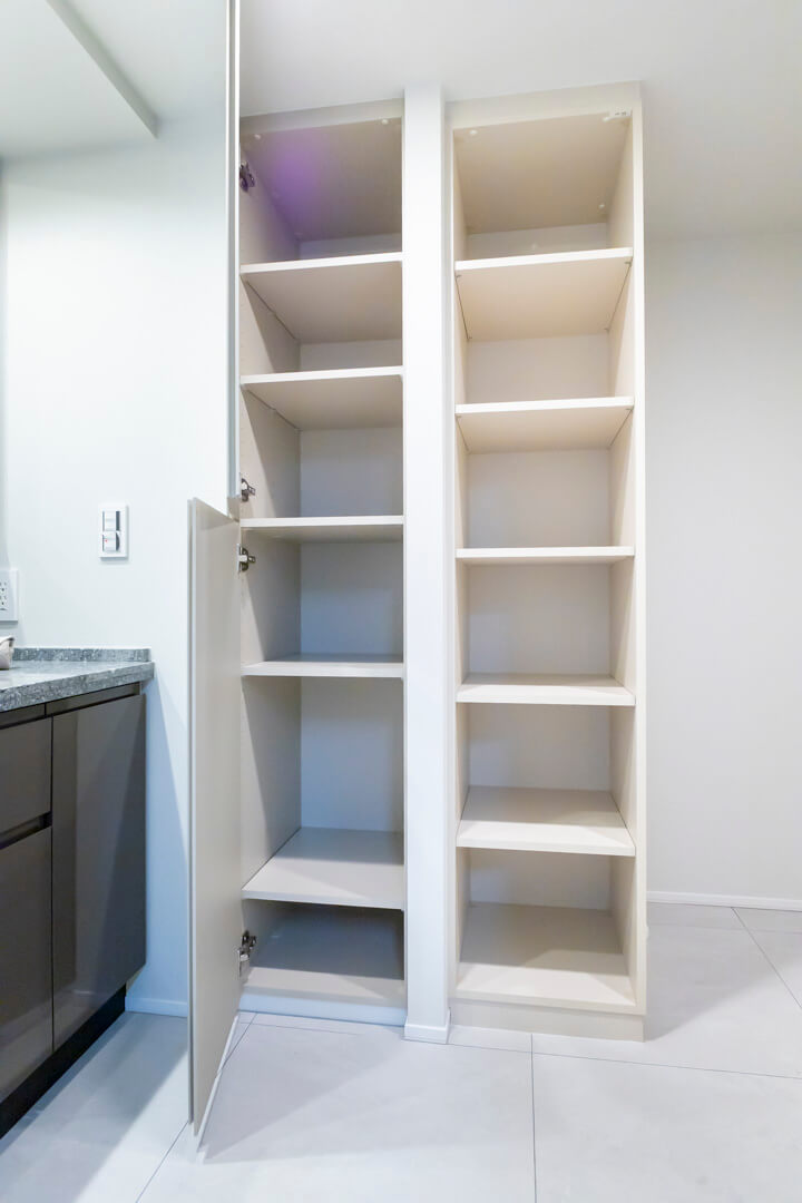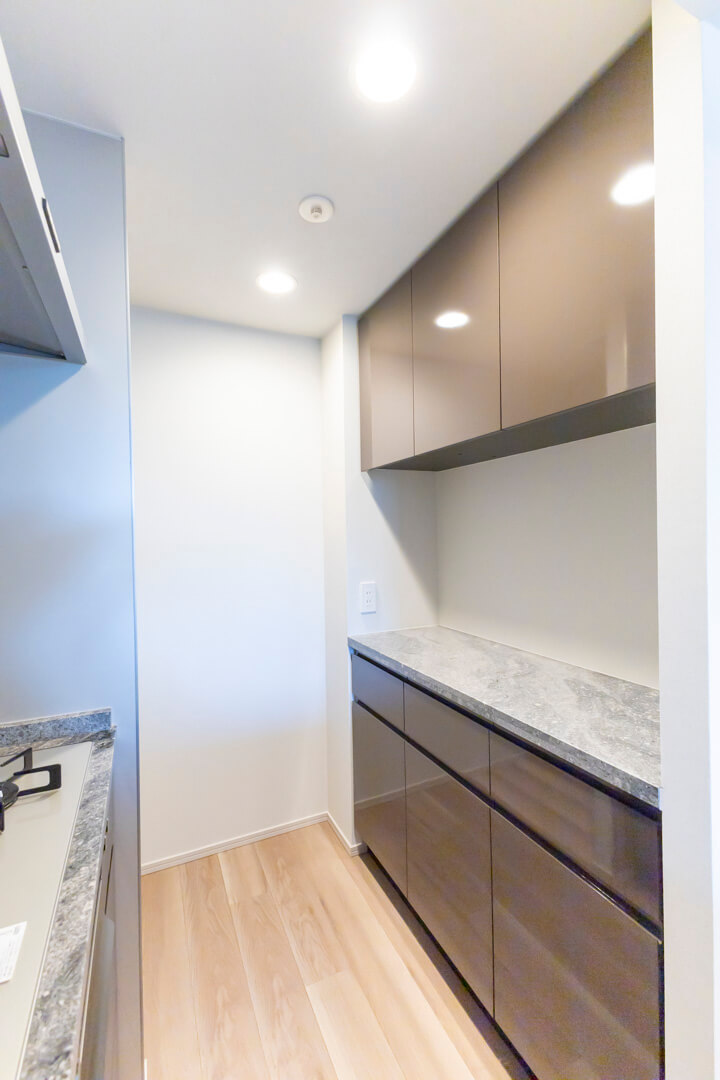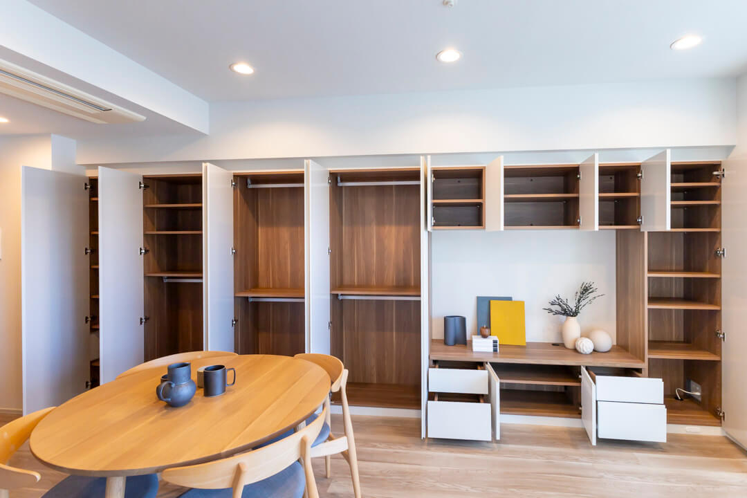 キッチンの背面側にはカップボードが備え付けられています。調味料や食器などを収納できるだけでなく、電子レンジなどを置くこともできるので便利です。