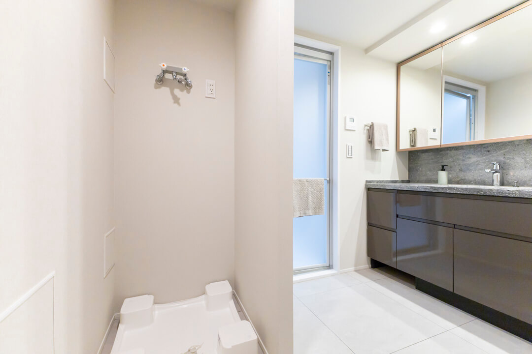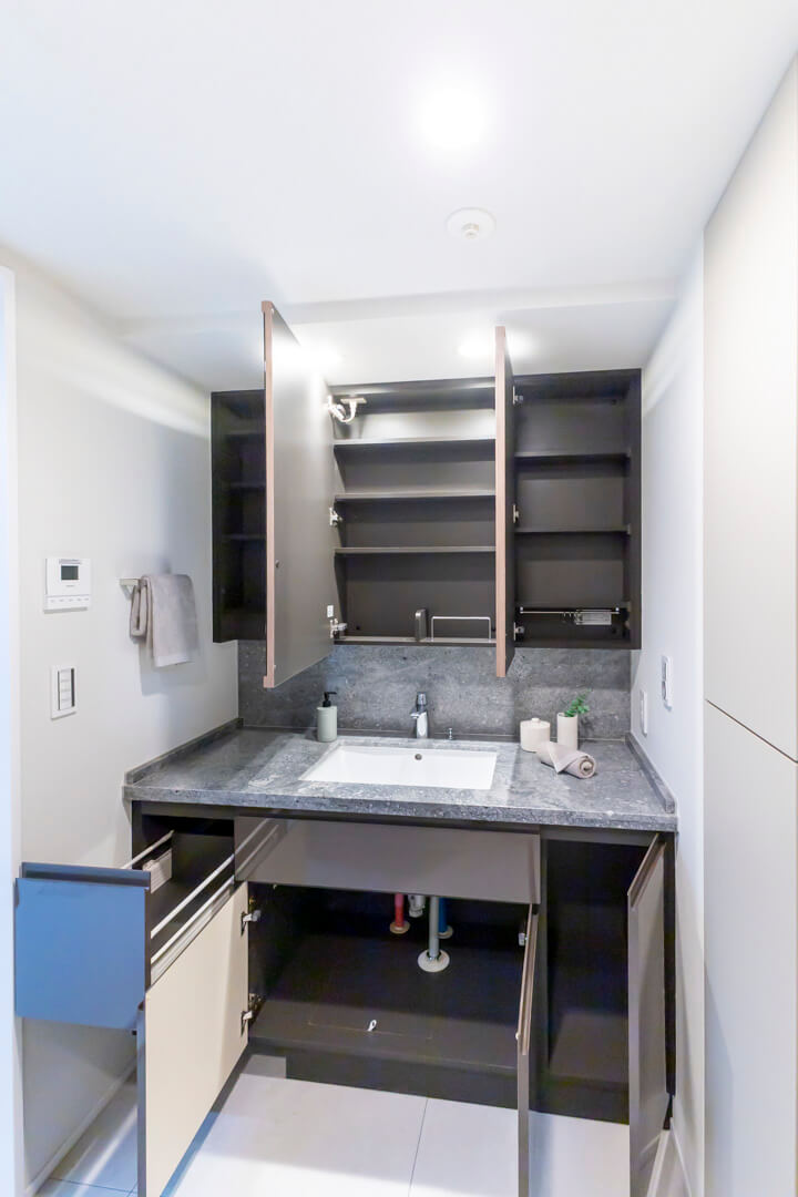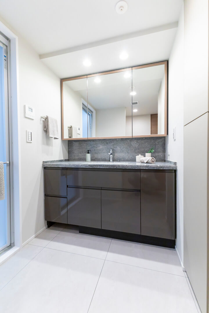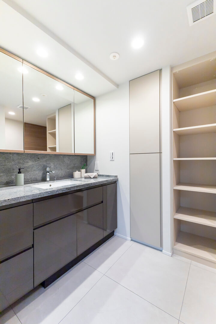 スタイリッシュな雰囲気の洗面化粧台です。大きな三面鏡の中には化粧品などが収納できて使い勝手良好。カウンターも広くて身支度もしやすそうですよ。また、横には棚が造られているので、リネン類などもきちんと整頓させることができそうです。
