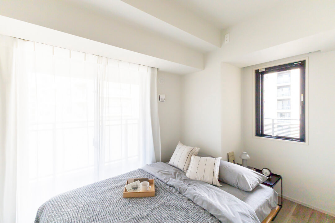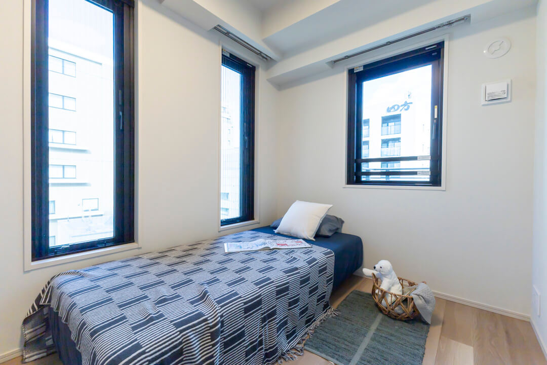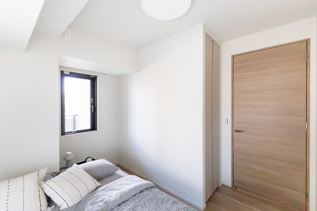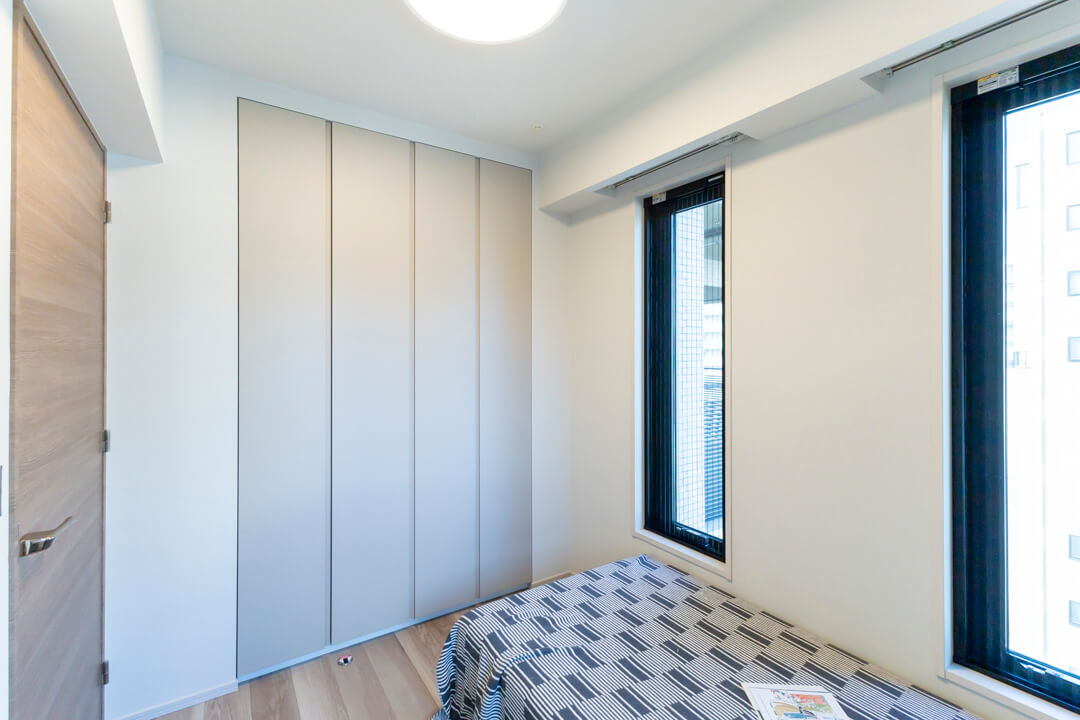 約4.0帖の寝室1は、コンパクトなお部屋ですが二面採光になっているので空間に圧迫感がありません。クローゼットも完備されていて、収納スペースも確保されています。書斎や趣味部屋にもぴったり。