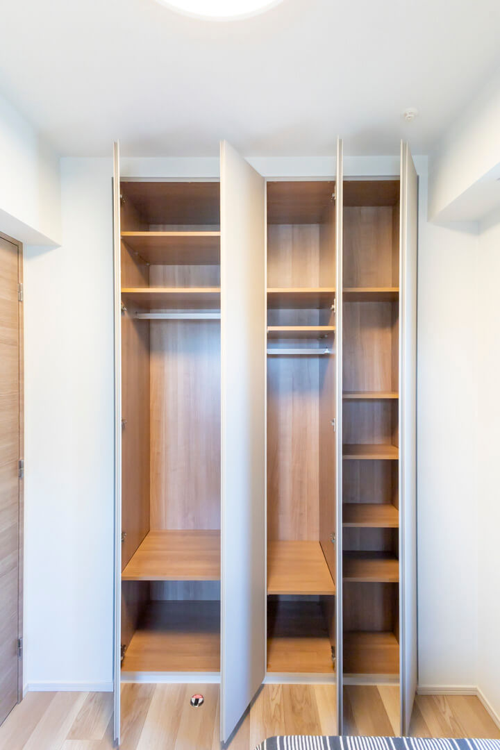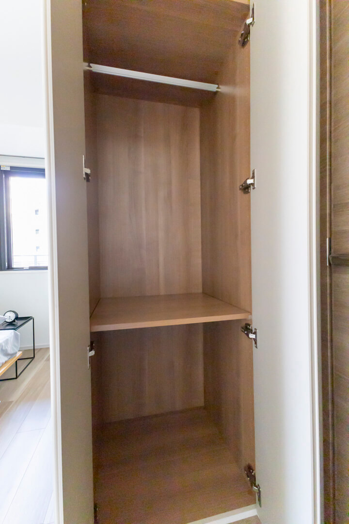 テレビを置くことができる便利な壁面収納が造られています。生活感が出がちな小物などもすっきりと収納することができるので嬉しいですね。さらに、クローゼットも設置されています。