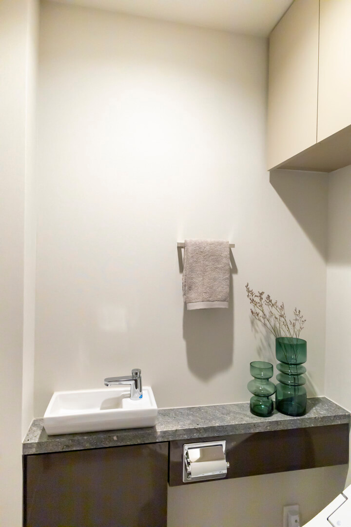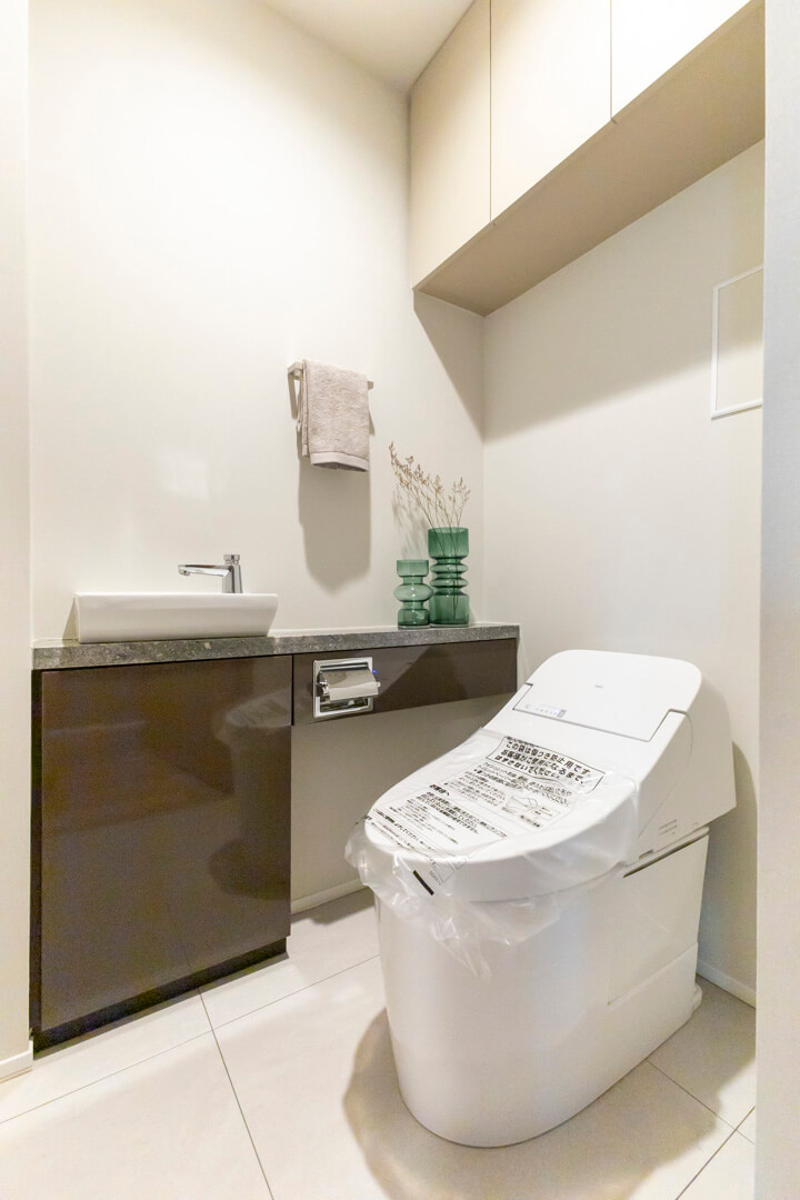 ウォシュレット一体型のトイレです。タンクレスタイプなのですっきりとした印象に。また、別途で手洗い器が造られているので、すぐに手を洗うことができて衛生的です。上部には吊戸棚が設置されていて、収納スペースもありますよ。カウンタースペースにはアロマなどを置いても◎。