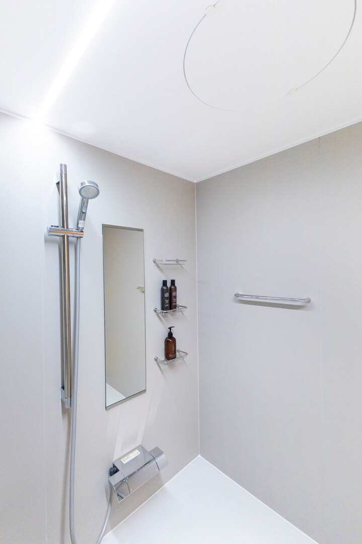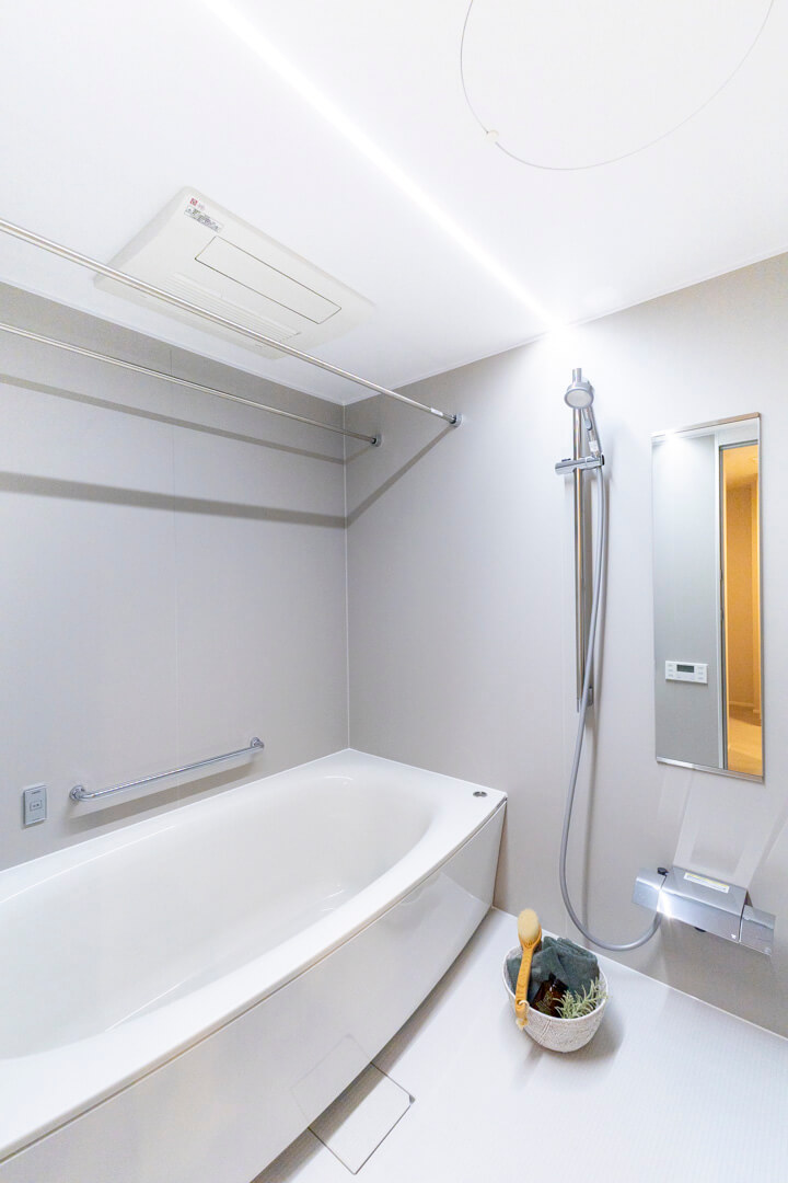 1620サイズでゆったりと入浴できるバスルームです。お風呂にゆっくり浸かるのが好きという方に嬉しい追い焚き機能を搭載。家族の入浴時間がずれてしまっても安心です。また、浴室乾燥機には暖房・乾燥・換気・涼風の機能がついています。さらに、照明の色が2色あるので、その日の気分に合わせて雰囲気を変えることができますよ。