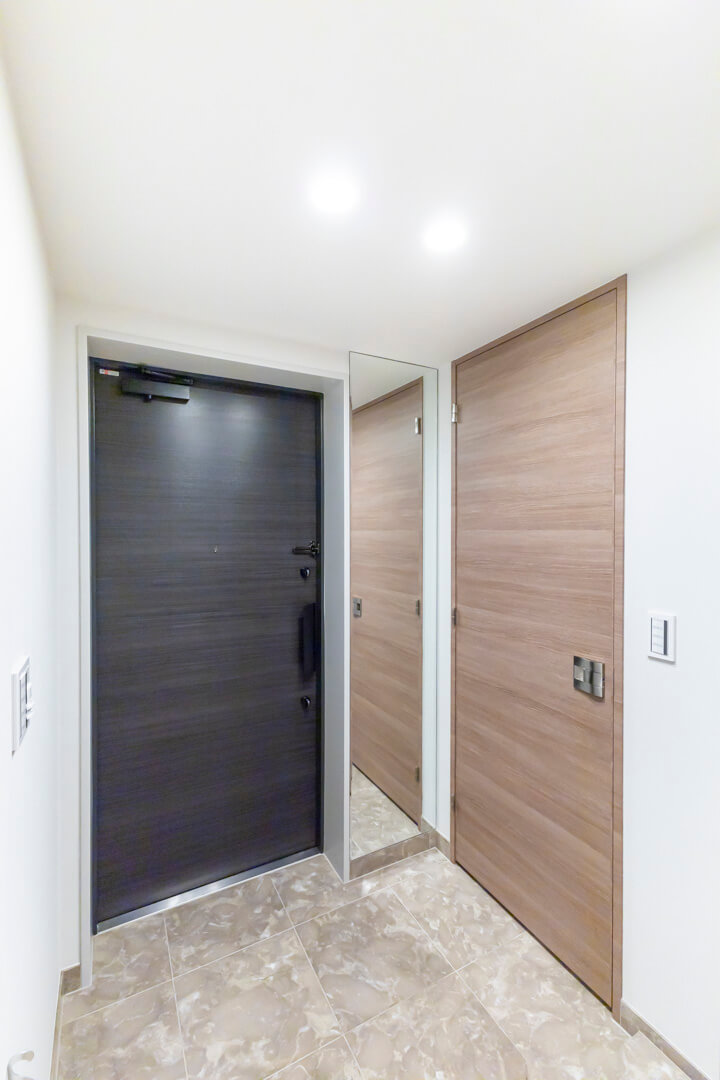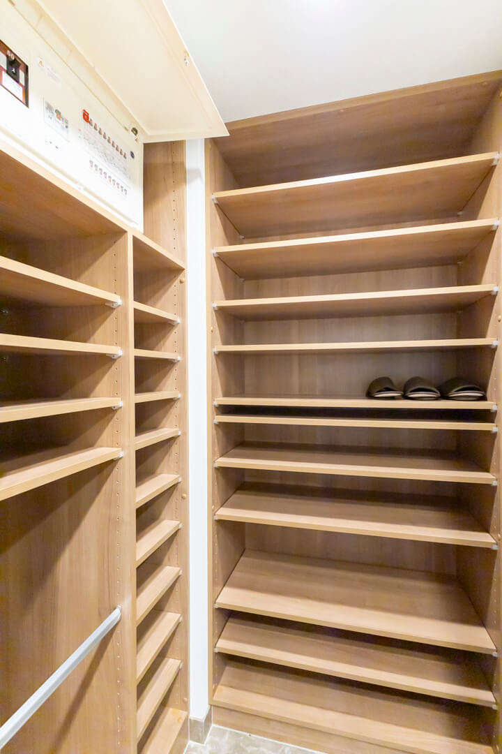 玄関にはシューズインクローゼットが造られています。たくさんの靴が収納できるだけでなく、傘立てスペースもあって◎。さらに、玄関の壁面には鏡が設置されているので、出かける際に全身のコーディネートをチェックすることができます。