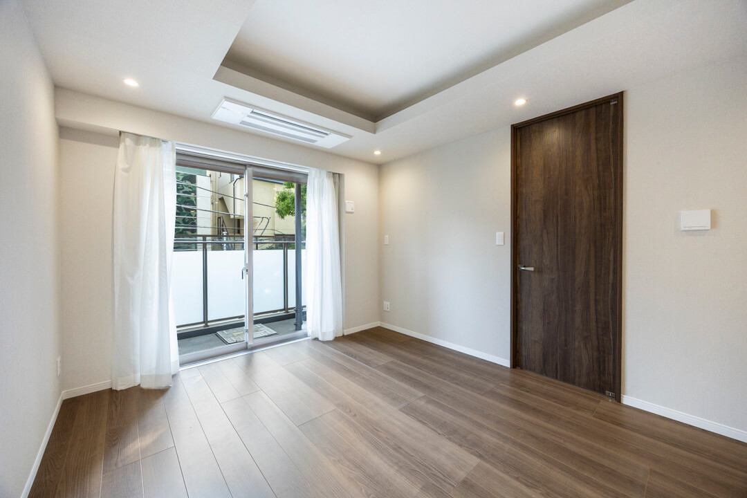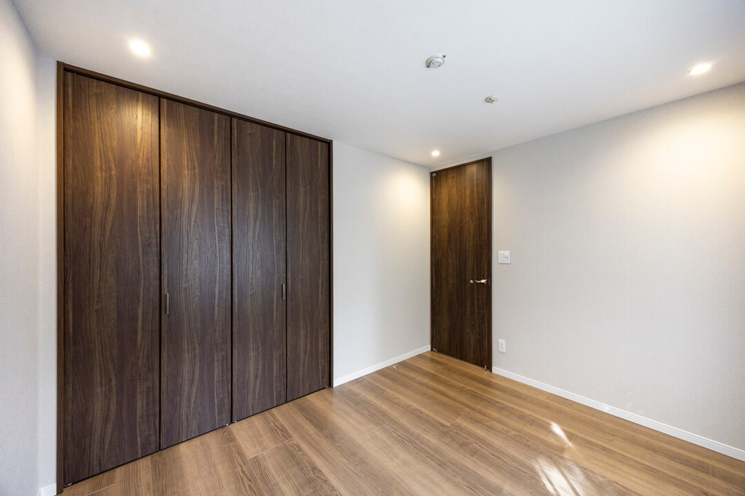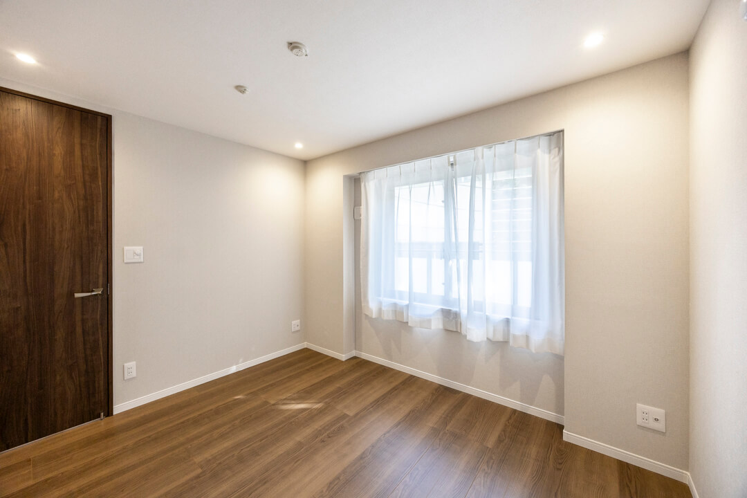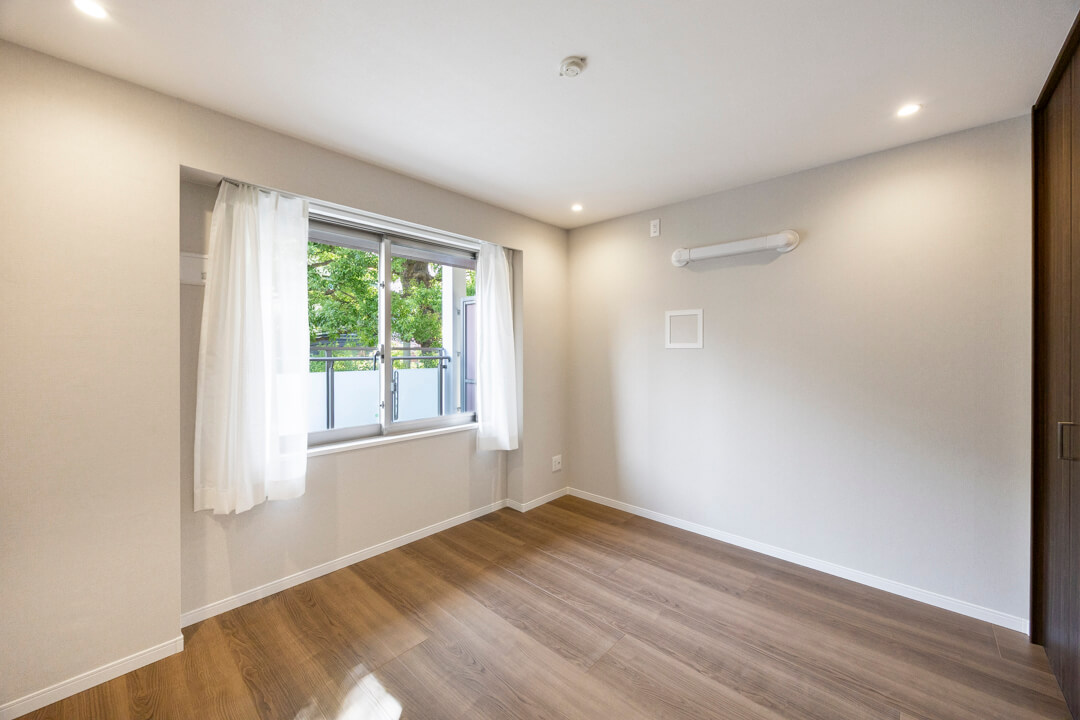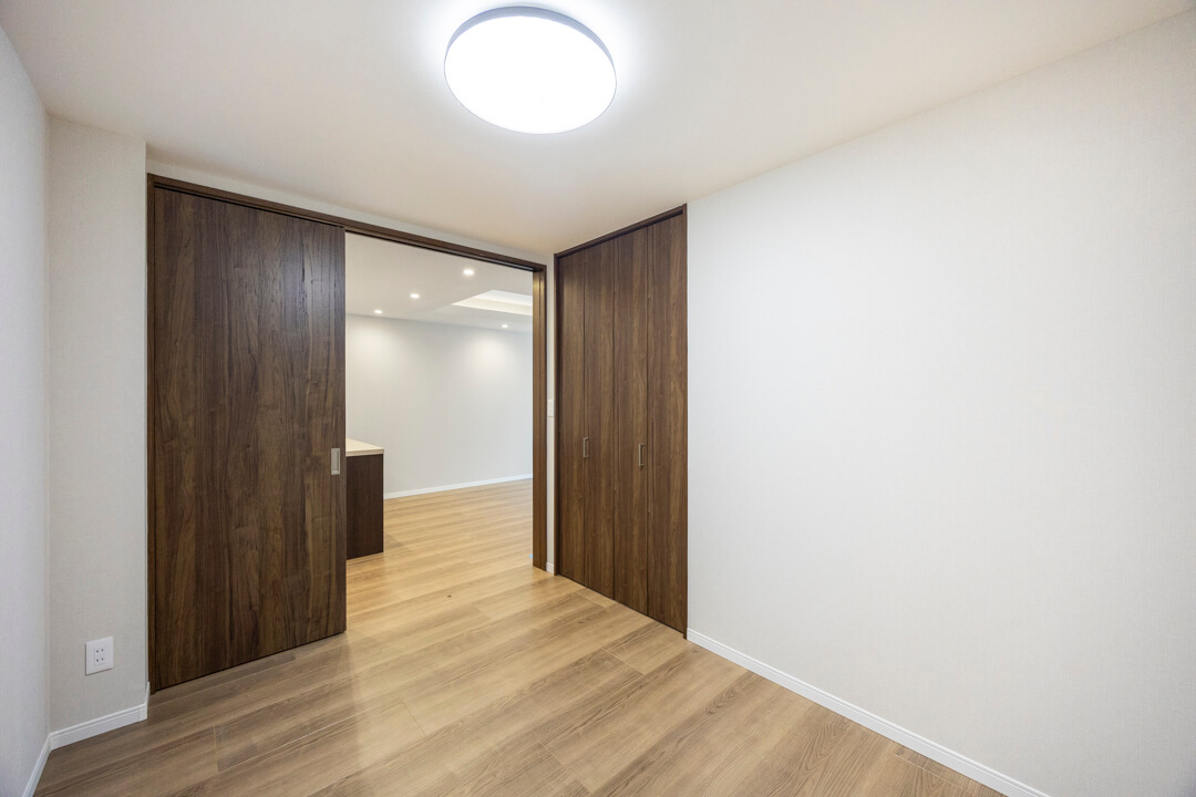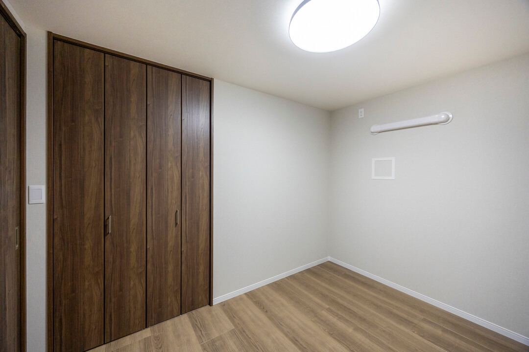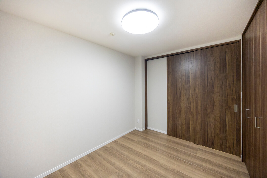約4.9帖の洋室2。凹凸が少なく、家具のレイアウトがしやすい空間です。LDKとは引き戸で仕切られているので、普段は扉を開放してゆったり過ごし、ゲストが来た時は扉を閉めてプライベート空間を隠すといった使い方も◎。ワークスペースや趣味部屋など、ライフスタイルに合わせて活用できそうです。