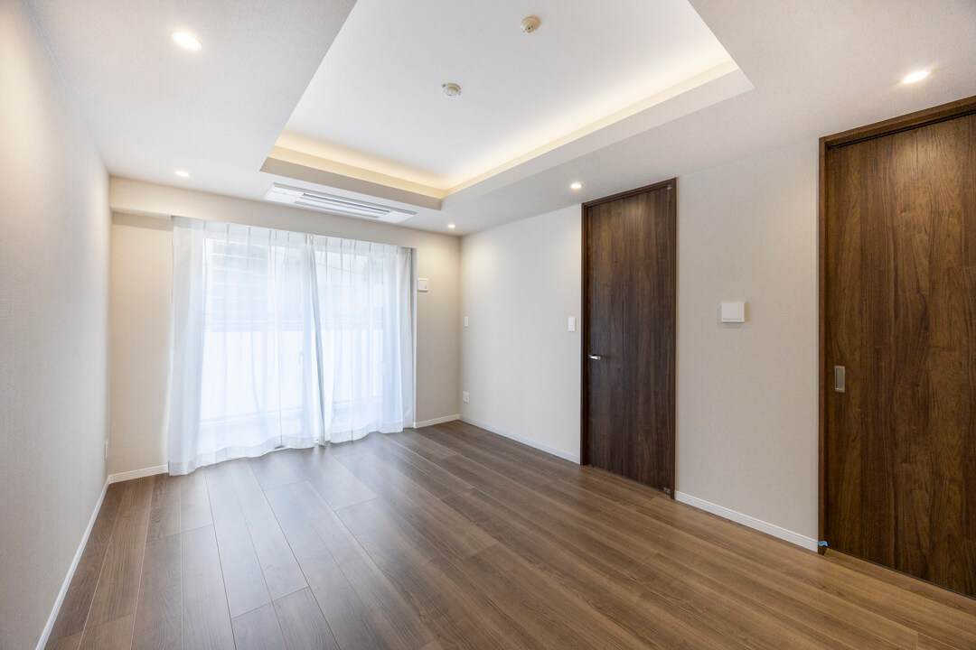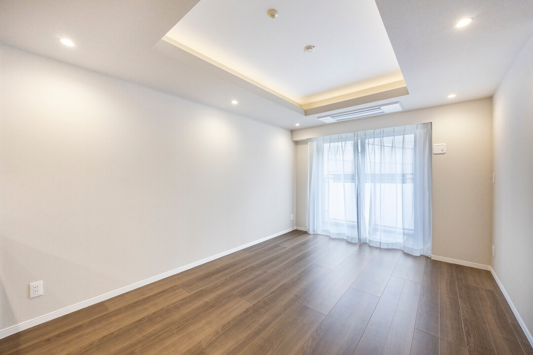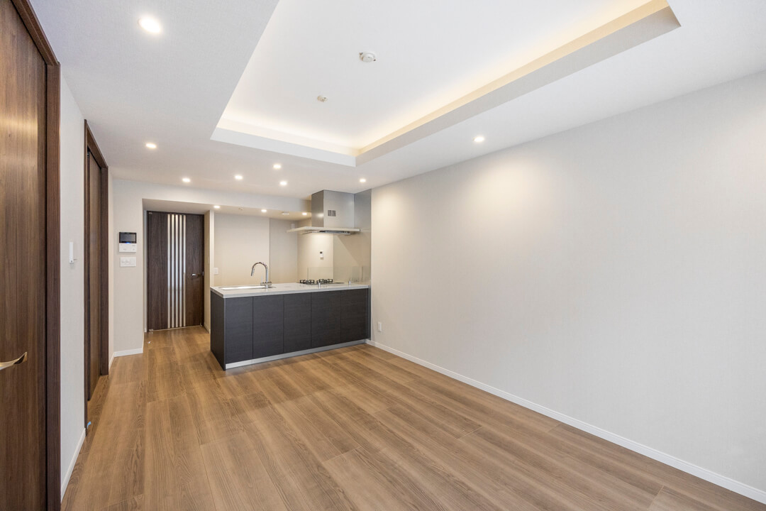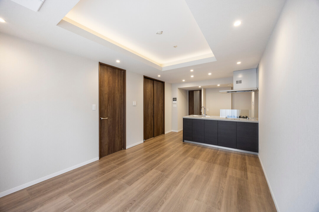 南向きの大きな窓からあたたかい光が降り注ぐリビングダイニング。キッチンと合わせて約14.0帖です。ホワイト系の壁紙に木目のフローリング&建具を採用したナチュラルな内装は、さまざまなテイストの家具と相性が良さそう。折り上げ天井に施された間接照明が、上質な空間を演出します。すっきりとしたビルトインエアコンが備え付けなのも嬉しいポイントです。