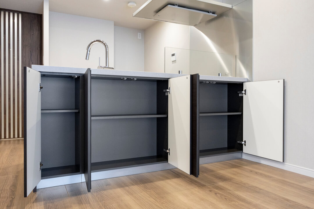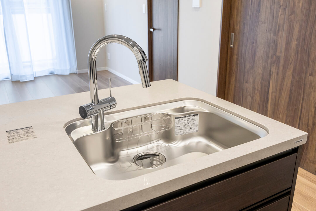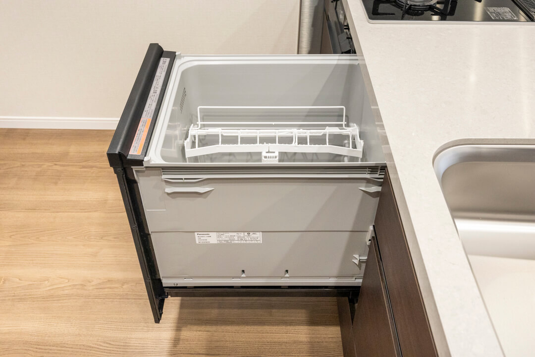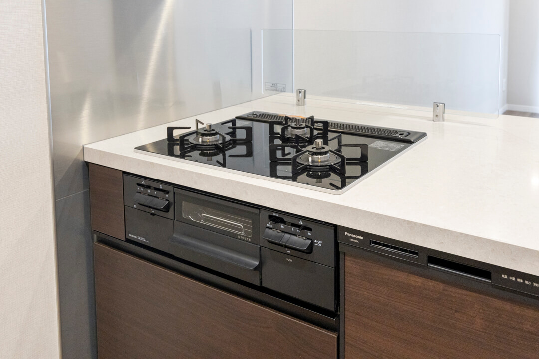 同時調理が叶うグリル付3口ガスコンロ、調理の際に手軽においしい水を使用できる浄水器一体型水栓を完備。食洗機も内蔵されているので、後片付けが捗り、節水効果も期待できます。快適なキッチン時間になりそうですね。