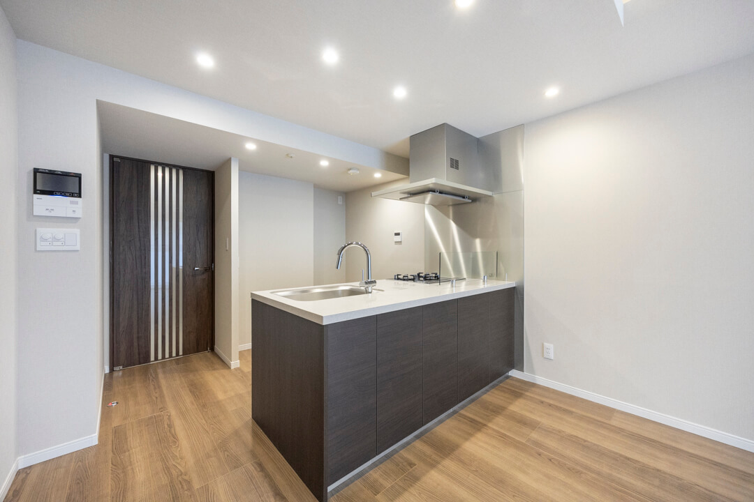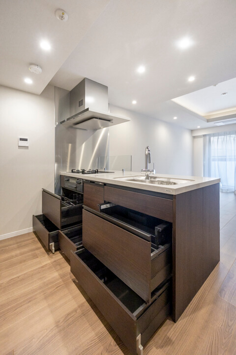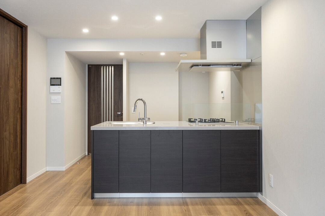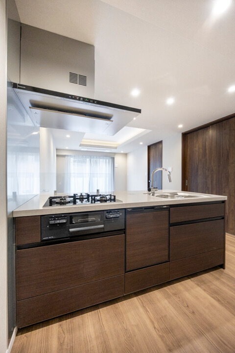 木目デザインが空間に調和するキッチン。開放的に調理ができる対面型です。パートナーやゲストとの会話を楽しみながら作業ができますね。コンロ前には油跳ねガードが設置されていて安心です。