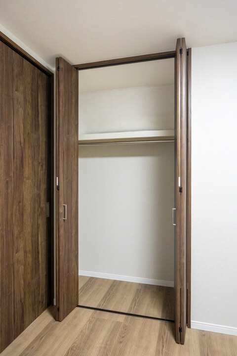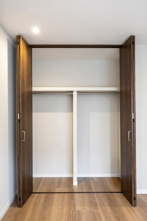 約6.0帖の洋室1。南向きで日当たり良好です。窓から緑が見えるのも嬉しいですね。4枚折れ戸のクローゼット完備で収納スペースもしっかり確保◎。主寝室にぴったりの空間です。