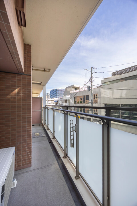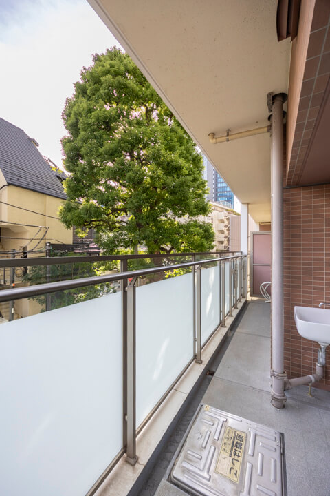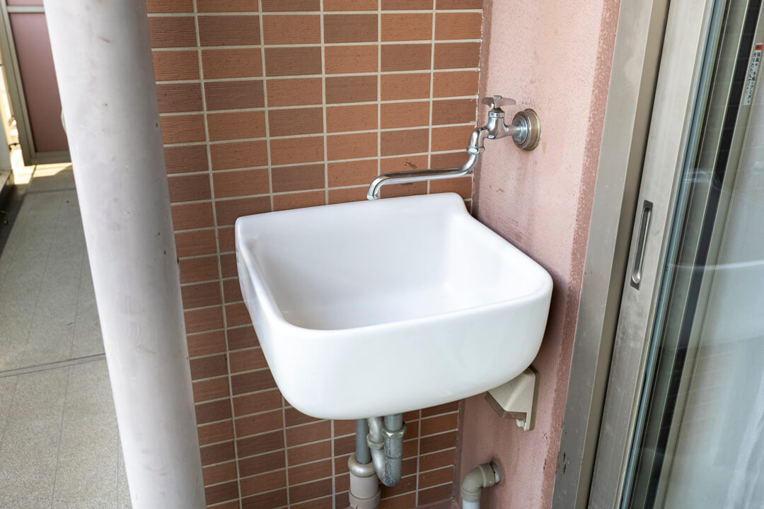 LDKと洋室1に跨るバルコニー。実測7.8㎡です。南向きのため、晴れの日にはあたたかい陽光が届きます。靴やアウトドア用品を洗ったり、お花の水やりに便利なスロップシンク付きなのも嬉しいポイントです。