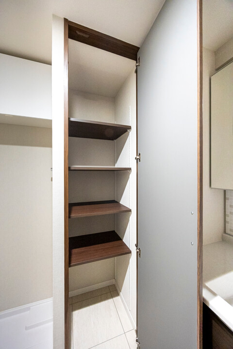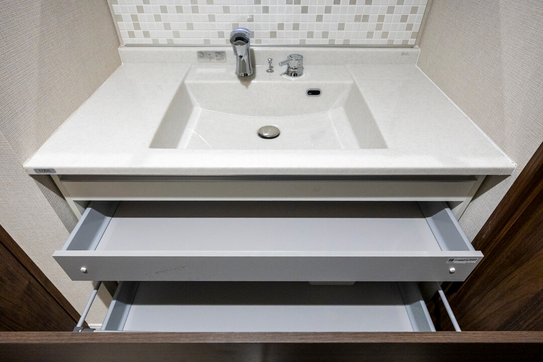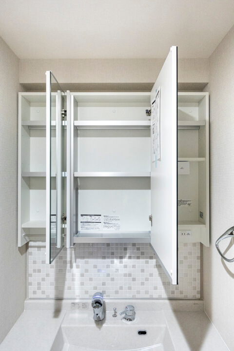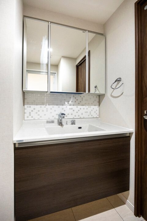 モザイクタイルのバックガードが印象的な洗面化粧台。照明入りの三面鏡付きで身だしなみを整えるのに便利です。カウンターにはゆとりがあり、化粧品やドライヤーの仮置きが可能。洗面ボウルとの継ぎ目や隙間がないので、汚れが溜まりづらくお手入れも簡単です。洗面台本体の収納に加え、リネン庫も付いていて、いつも清潔な洗面室をキープできそうです。
