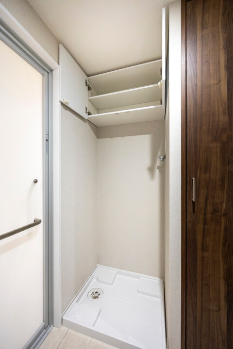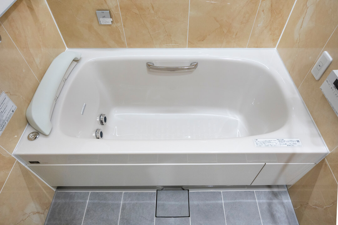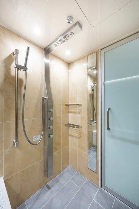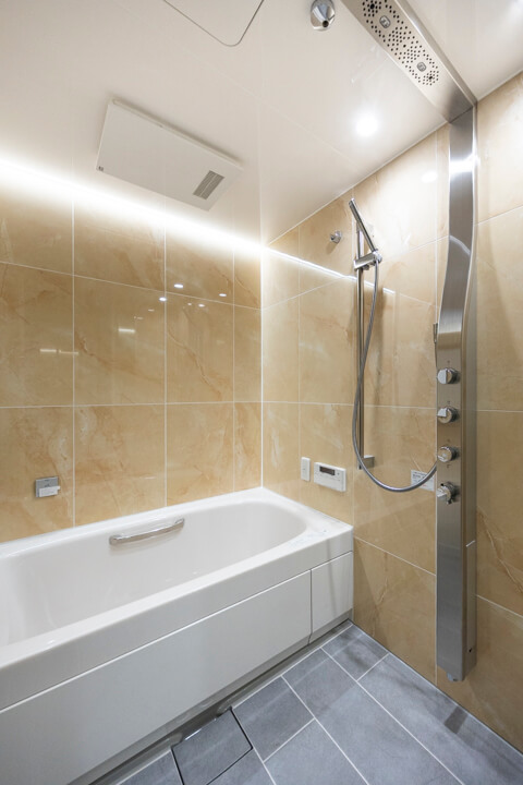 間接照明が上質な雰囲気を演出するバスルーム。ジェットバス機能が搭載されていて、2つの穴から吹き出す泡の力が力で身体をほぐしてくれます。浴室換気乾燥暖房機・追い焚き機能も搭載されていて、1年中快適なバスタイムに。シャワーは2種類設置されていて、全身でシャワーを浴びることができるオーバーヘッドシャワーでは、高い保温効果が期待できます。