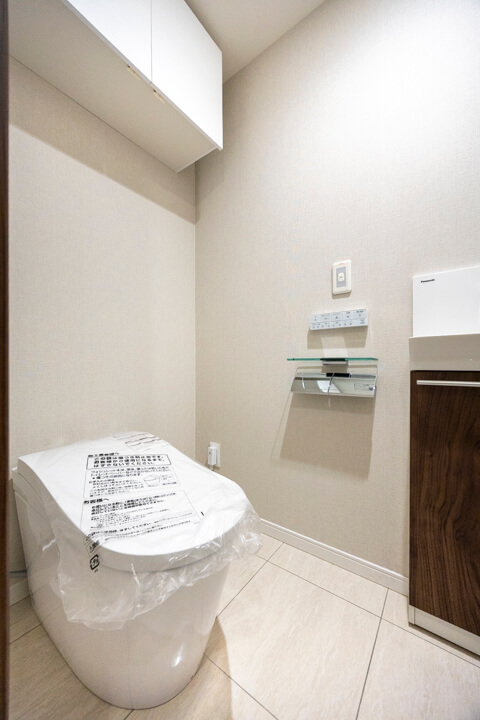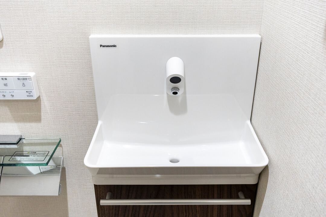 廊下に面していて独立性の高いレストルーム。TOTO製の洗浄機能付トイレに交換済みです。便フタは自動開閉式なので、直接触れることなく使用できて衛生的。便利な手洗い器付きで、ゲストを洗面室まで案内する手間もかかりません。