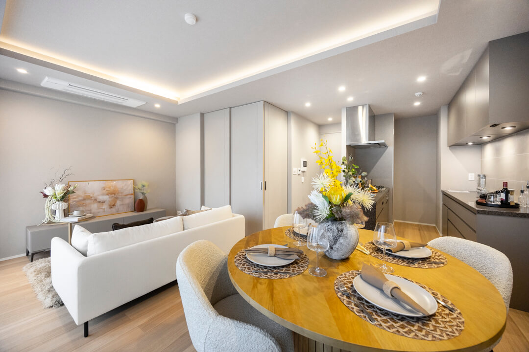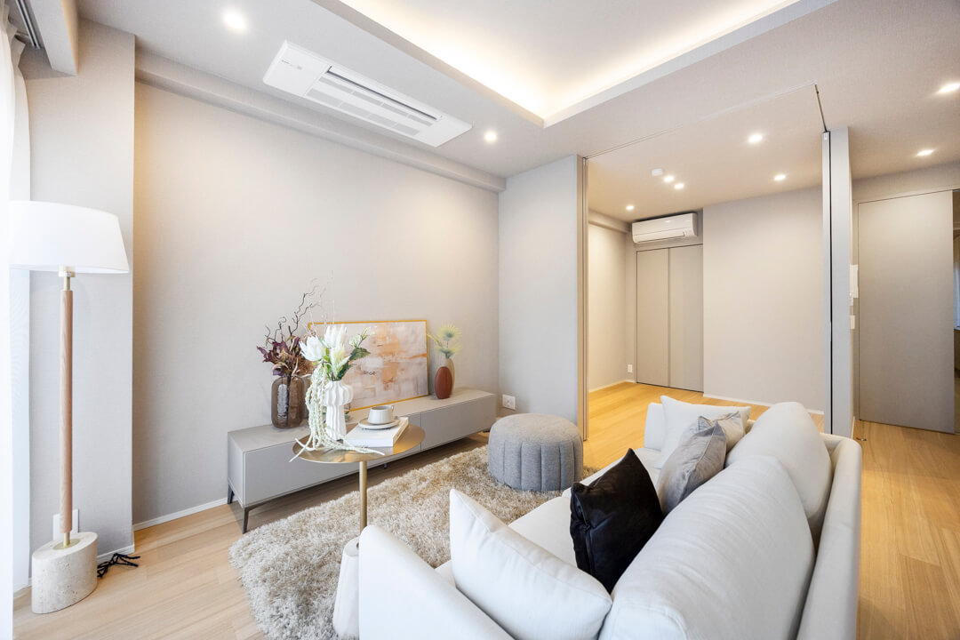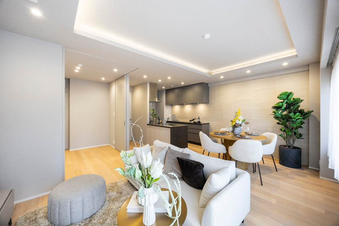 約16.1帖のLDK。大開口の窓や折り上げ天井が空間に奥行きをもたらします。スタイリッシュなビルトインエアコン備え付けなのも嬉しいですね。グレー基調の内装にアクセントウォール&間接照明が加わり、洗練された空間を演出します。