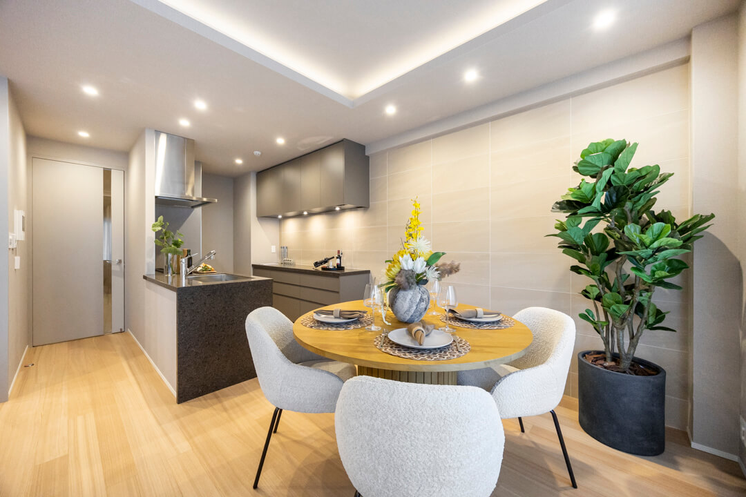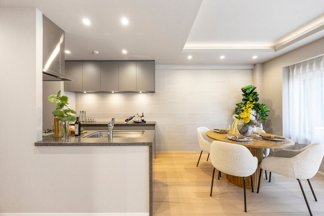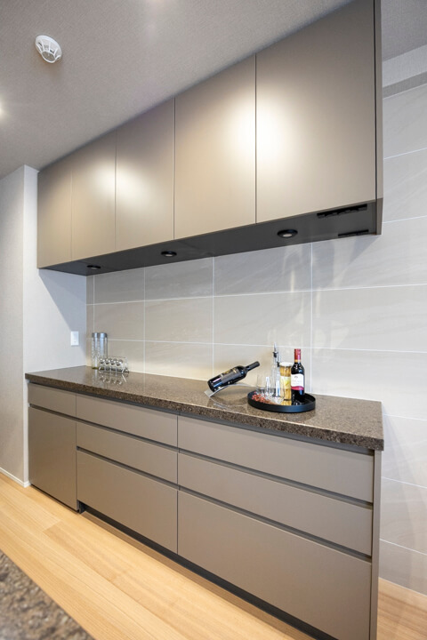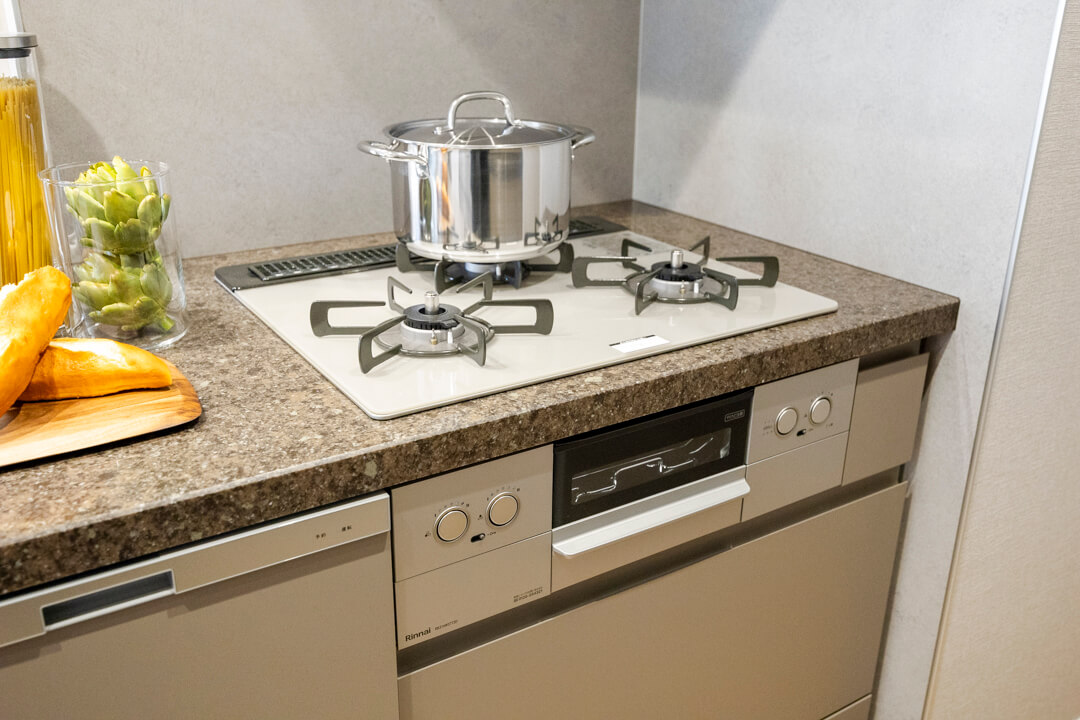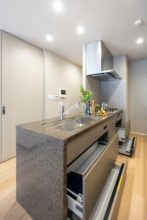 石調カウンターで高級感の漂うキッチン。リビングに続くアクセントウォールも印象的です。シンク側からはリビングダイニングを見渡すことができ、ほど良いこもり感と開放感のある空間。油跳ねが気になるコンロ側にはしっかり壁があって安心です。グリル付3口ガスコンロや浄水器一体型水栓、食洗機内蔵で調理も後片付けも捗りそうです。