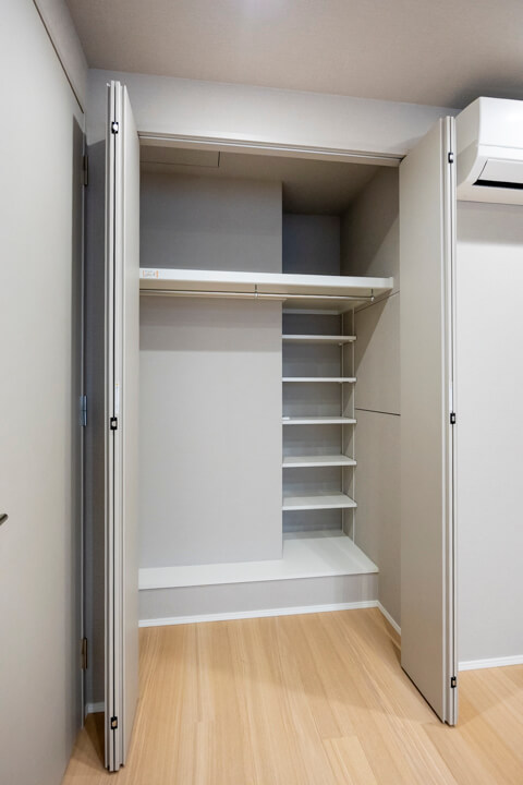 約6.0帖の寝室1。リビングから離れたプライベート性の高い部屋位置で、主寝室におすすめです。クローゼットは奥行きがあり、ハンガーパイプと可動棚を設置。洋服はもちろん、小物も整理整頓しやすいです。