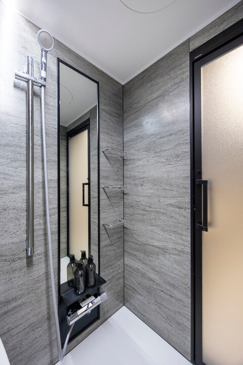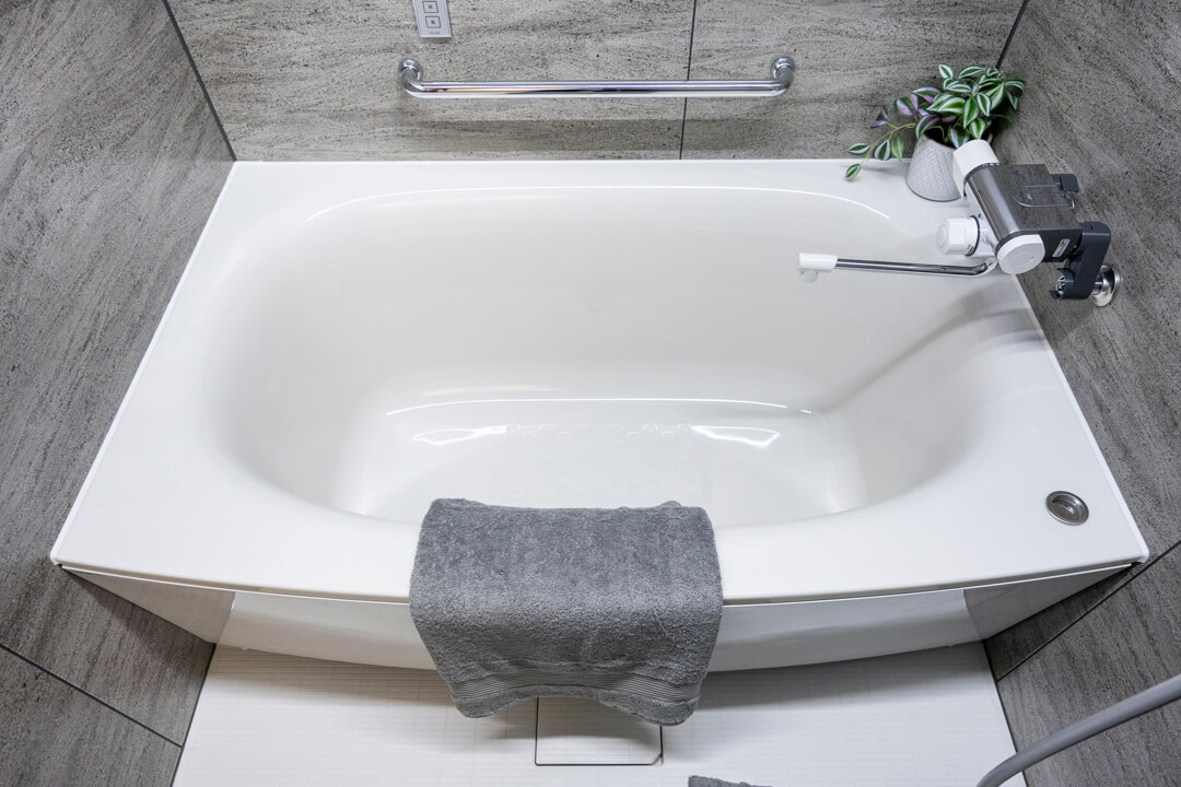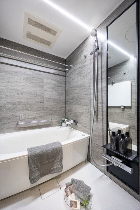石柄パネル&ライン照明がスタイリッシュな雰囲気を演出するバスルーム。1317サイズです。寒い日も快適に入浴でき、カビ対策や雨の日のお洗濯にも活躍する浴室換気乾燥暖房機を搭載しています。照明には調光機能が付いていて、お休み前のくつろぎタイムには暗めの明かりにするなど、シーンに合わせて使用できます。