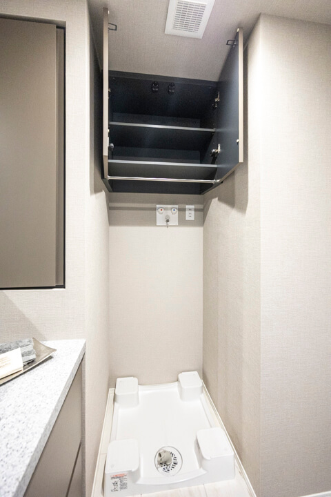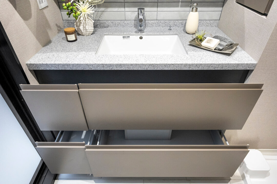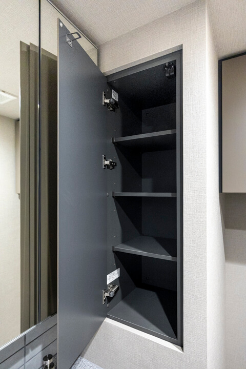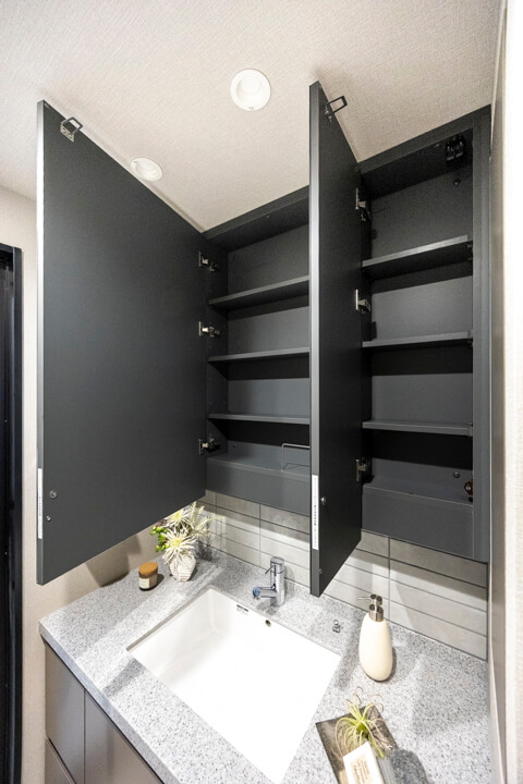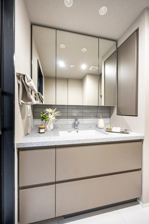洗練されたデザインが印象的な洗面化粧台。大きな三面鏡付きで身だしなみを整えるのに便利です。鏡の裏は収納棚になっていて、洗面まわりの小物をすっきり収納できますよ。壁面にも棚があり、タオルや化粧水の収納に便利です。