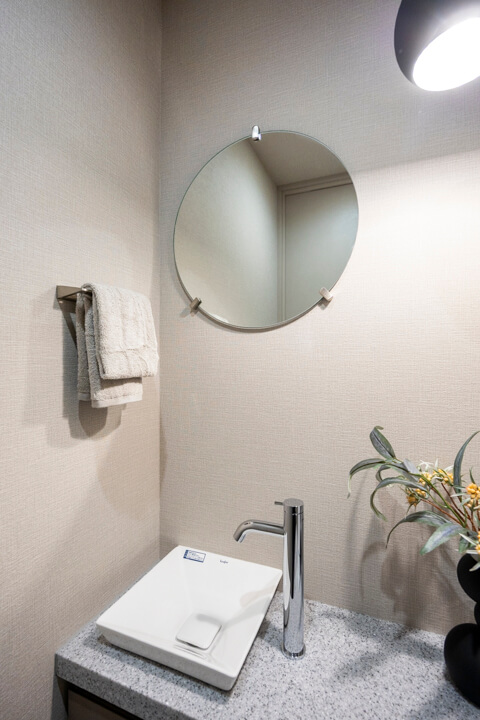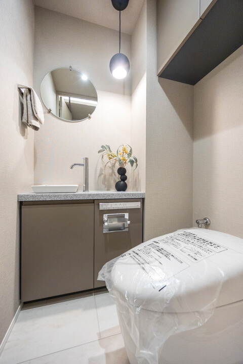 廊下に面していて独立性の高いレストルーム。TOTO製の洗浄機能付トイレに交換済みです。タンクレス仕様でスタイリッシュ。洗面台と同じデザインの手洗いカウンターが設置されていて、すぐに手を洗うことができます。丸いミラーがアクセントになり、身だしなみチェックができるのも嬉しいですね。