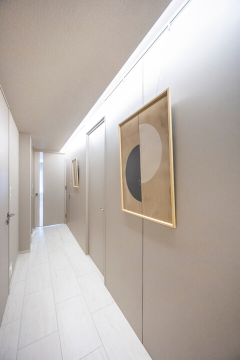 玄関には間接照明が設置され、スタイリッシュな雰囲気。ピクチャーレールを活用して、掛けるインテリアを楽しめるのもポイントです。大容量のシューズボックス完備で散らかりがちな靴をすっきり収納できます。