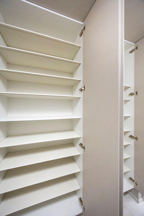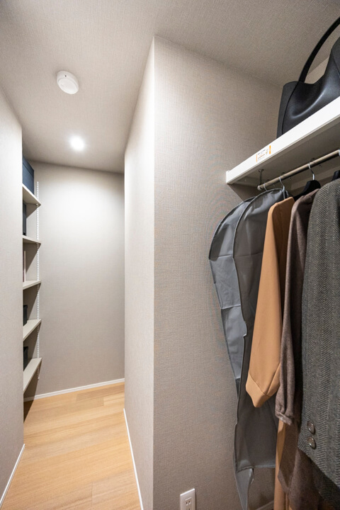 LDKを出てすぐ右手にはファミリークロークを完備しています。ハンガーパイプ&可動棚備え付けで、使い勝手良好◎。コート類はもちろん、日用品ストックや掃除用品の収納にも重宝しそうです。充実の収納力で、すっきりとした居住空間を実現できそうですね。