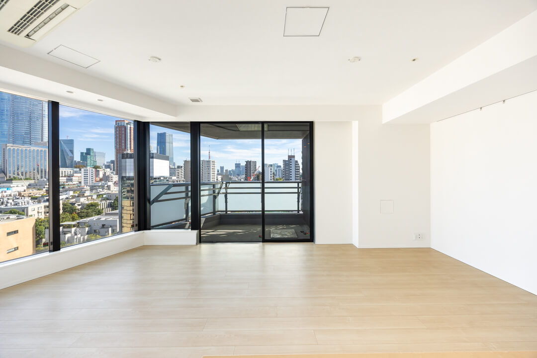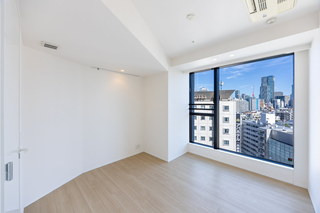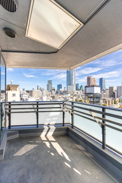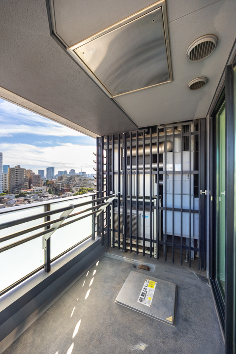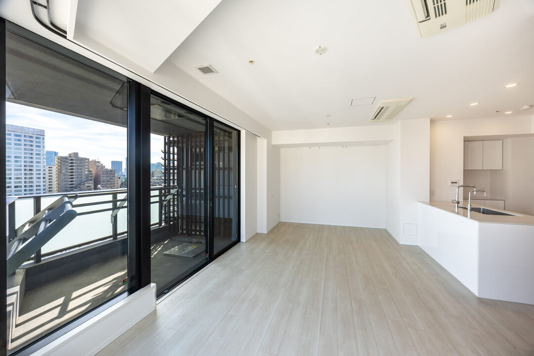 LDKに面するバルコニー。午前中から明るい光が届く東向きです。バルコニーに出て朝日を浴びると、すっきり目覚められそうですね。13階部分につき眺望良好◎。都心らしい景色の中に、木々の緑が見えるのが嬉しいポイントです。東京タワーの先端部分も見えましたよ。遠く広がる青空を望み、ほっとリフレッシュできる場所になりそうです。