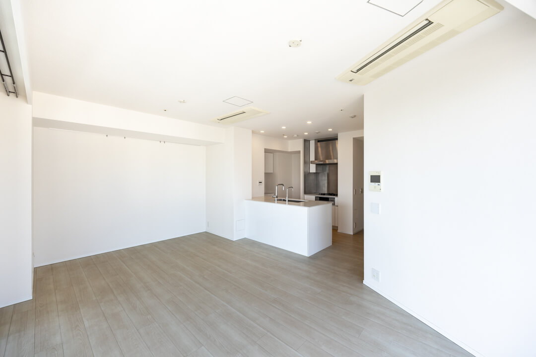 バルコニー付きの2面採光で開放的なリビングダイニング。奥行きたっぷりで、遠く広がる青空を見渡すことができます。スタイリッシュなビルトインエアコンが採用されているのも嬉しいポイント。すっきりとした見た目で、広々とした印象になります。ピクチャーレールを活用し、自分好みの空間づくりをお楽しみください。