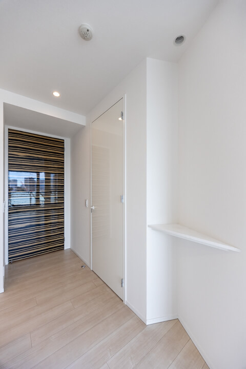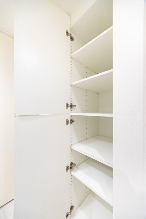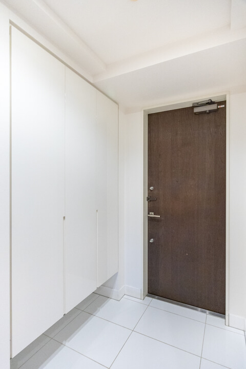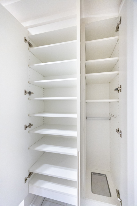 白基調ですっきりとした印象の玄関。入って右手にはトールタイプのシューズボックスが設置されています。自由度の高い可動棚で、靴はもちろん、傘も収納できますよ。