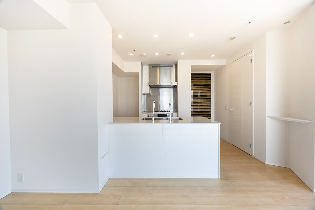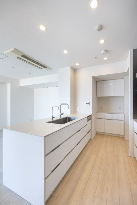 約4.1帖のキッチンスペース。白基調で清潔感のある空間です。作業・収納スペースともに広く、動線の短いⅡ型タイプです。シンク側からはリビングダイニングを見渡すことができ、パートナーやゲストとの会話が弾みそう。油跳ねが気になるコンロ側にはしっかり壁があって安心です。