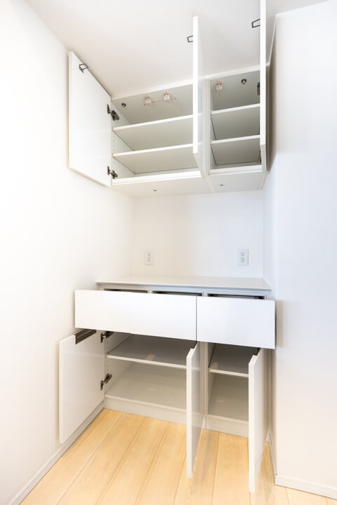 奥にはキッチンと同じデザインのカップボードを完備。食料品のストックや食器類をすっきり収納できます。カウンターにはコンセントが付いていて、炊飯器やコーヒーメーカーといったキッチン家電の使用に便利です。