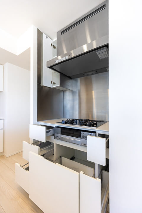グリル付3口ガスコンロ・食洗機内蔵で調理も後片付けも捗ります。さらに、シンクにはディスポーザーを設置。生ごみ処理の手間が軽減され、悪臭の原因を防いでくれます。