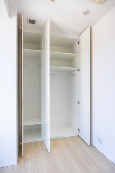約4.5帖の洋室2。大きな窓があるため、コンパクトながらも圧迫感なく過ごすことができます。クローゼット完備で収納スペースもしっかり確保◎。ハンガーパイプ&棚板の高さを調節でき、隅々までたっぷり収納できます。ワークスペースや趣味部屋におすすめの空間です。