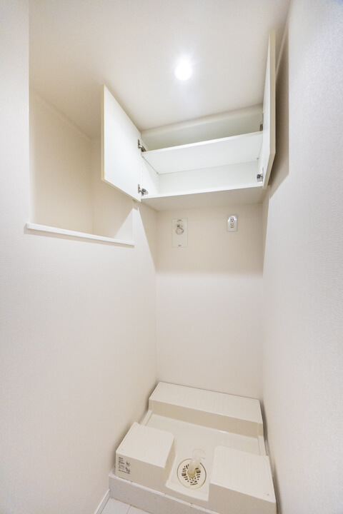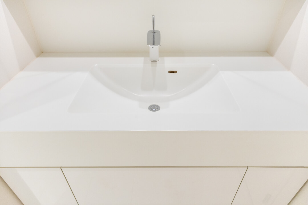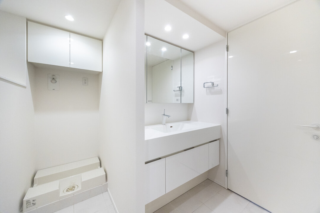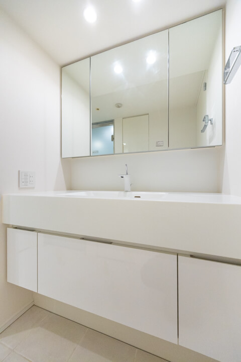 白基調で清潔感のある洗面室。大きな三面鏡付きで身だしなみを整えるのに便利です。カウンタースペースにはゆとりがあり、化粧品やドライヤーの仮置きが可能。洗面ボウルと一体成型で、汚れが溜まりづらくお手入れしやすいのも嬉しいポイントです。リネン庫付きで収納性が高く、いつも清潔な洗面室をキープできそうです。