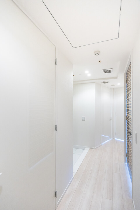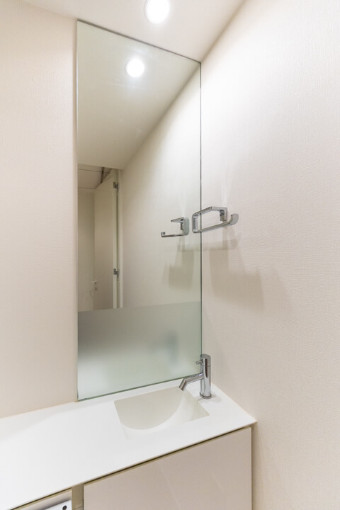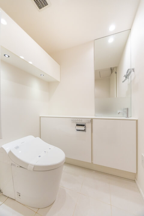廊下に面していて独立性の高いレストルーム。TOTO製の洗浄機能付トイレに交換済みを採用しています。タンクレス仕様でスタイリッシュ。手洗いカウンターが設置されているのですぐに手を洗うことができ、ゲストを洗面室まで案内する手間もかかりません。