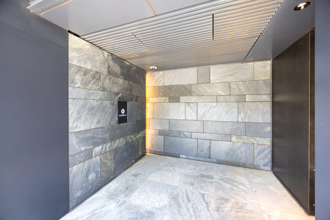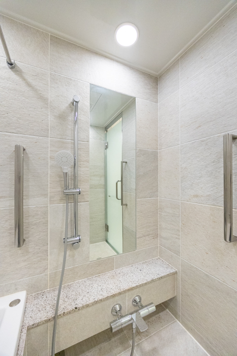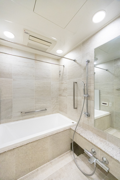 石調デザインで高級感の漂うバスルーム。換気・暖房・乾燥・涼風機能付きで1年中快適なバスタイムを過ごせます。お風呂にゆっくり浸かるのが好きという方に嬉しい追い焚き機能も搭載されていますよ。家族の入浴時間がずれてしまった時も安心ですね。