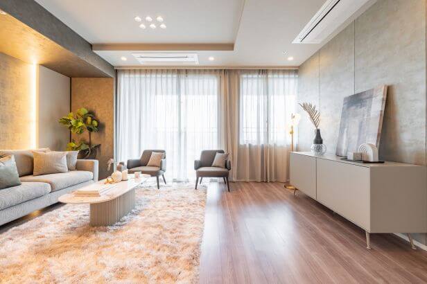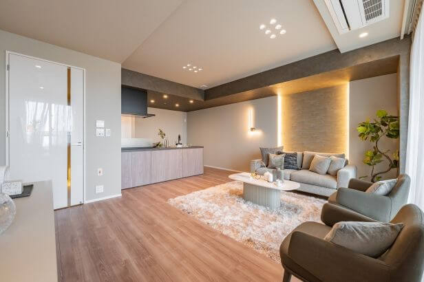 キッチンスペースを含め、約18.5帖のLDK。家族でゆったり過ごせる広さです。アクセントウォールや間接照明が施されていて空間の演出性もUP。南東向きで自然な光が入り、バルコニーへの出入りも可能です。